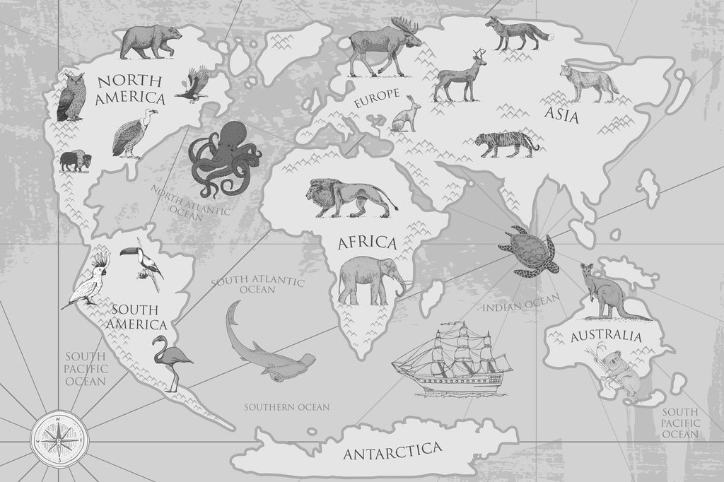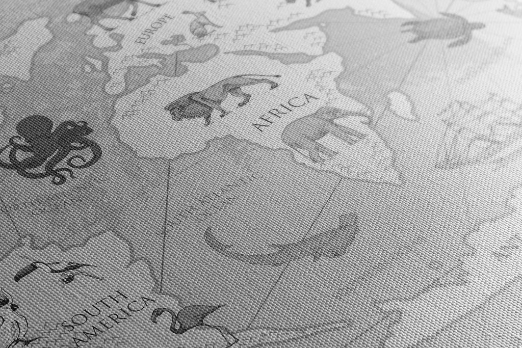 Obraz kreslená mapa sveta s zvieratami v čiernobielom prevedení