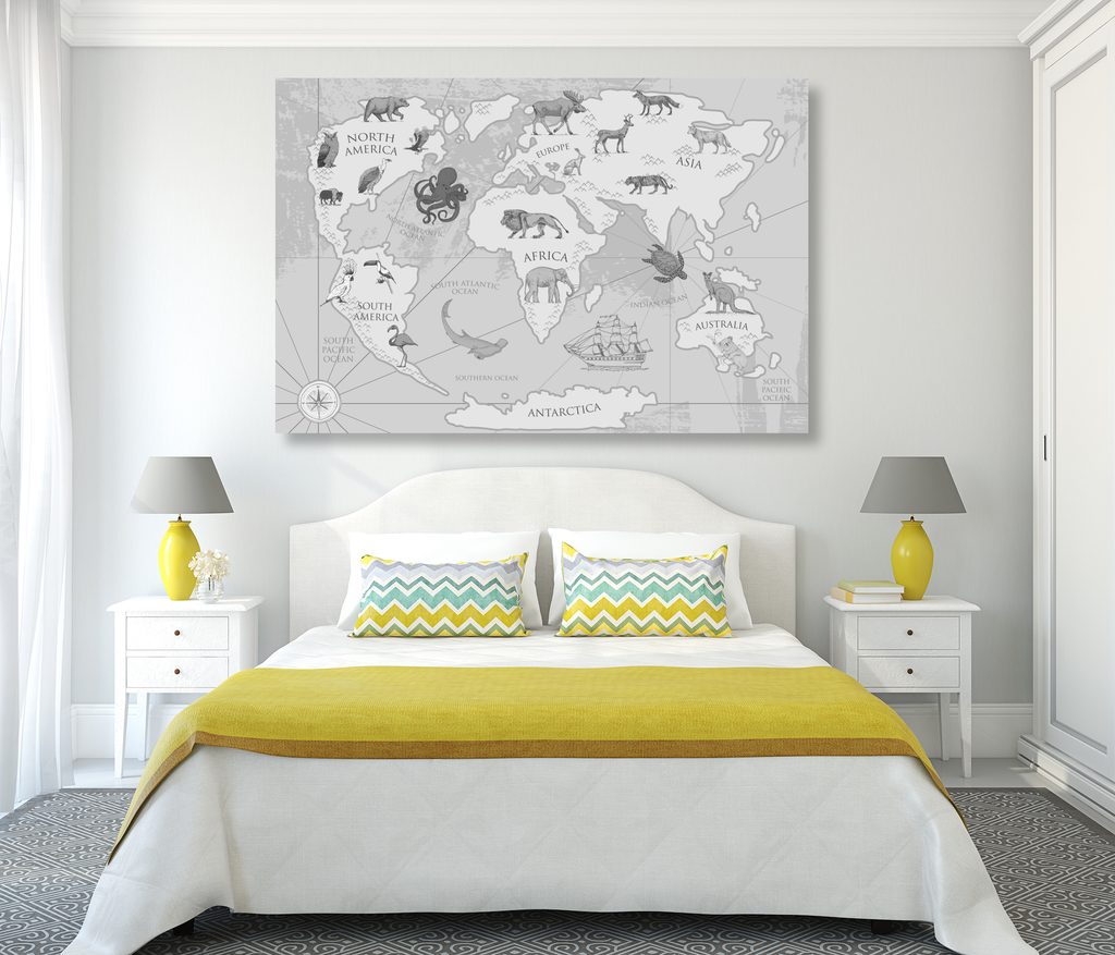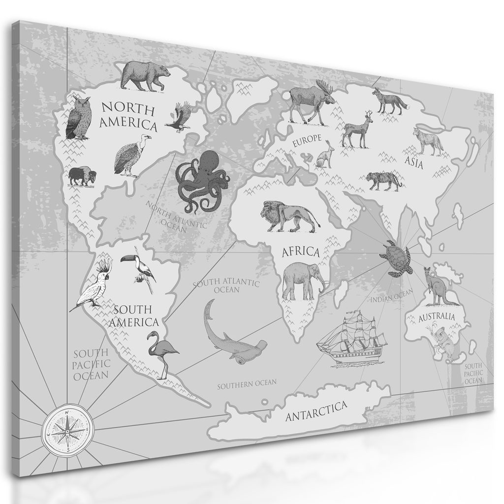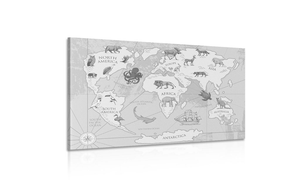 Obraz mapa sveta v čiernobielom prevedení