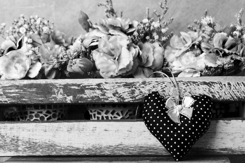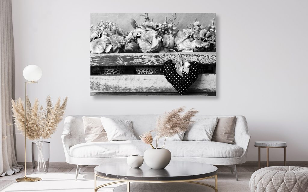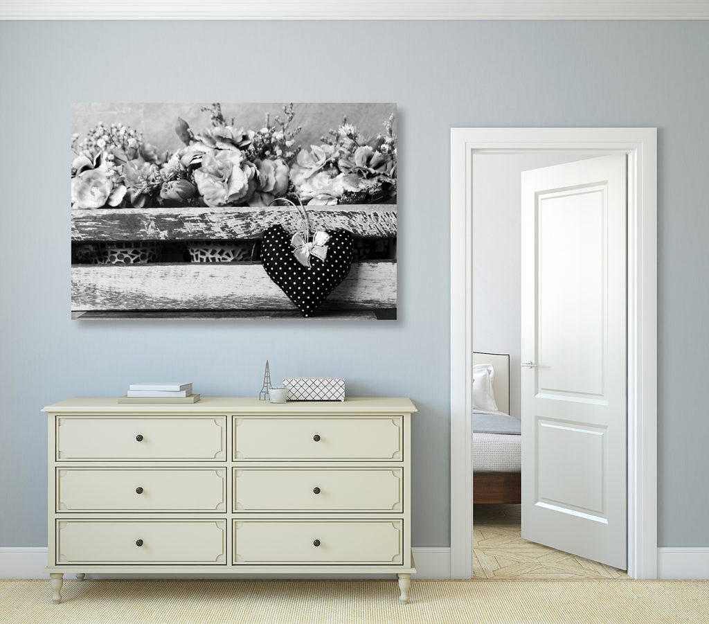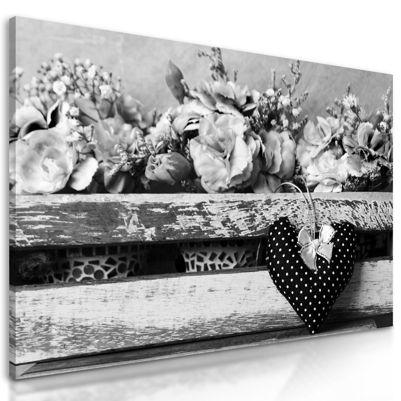 Obraz kvety karafiátu a srdiečko v čiernobielom prevedení