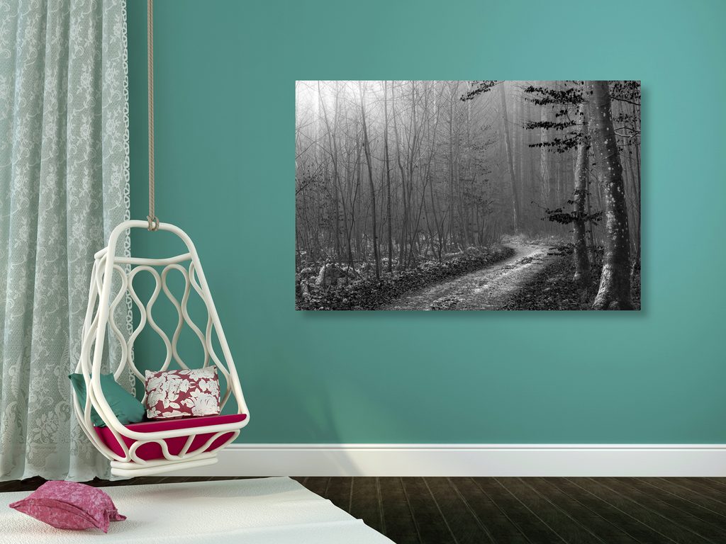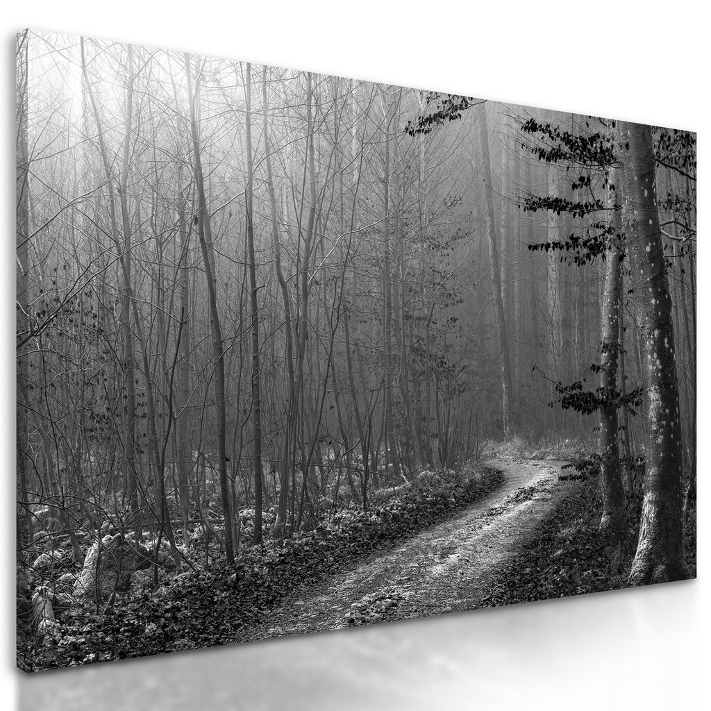 Obraz lesná cesta v čiernobielom prevedení