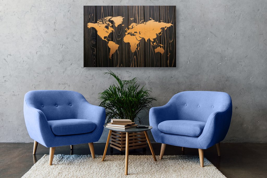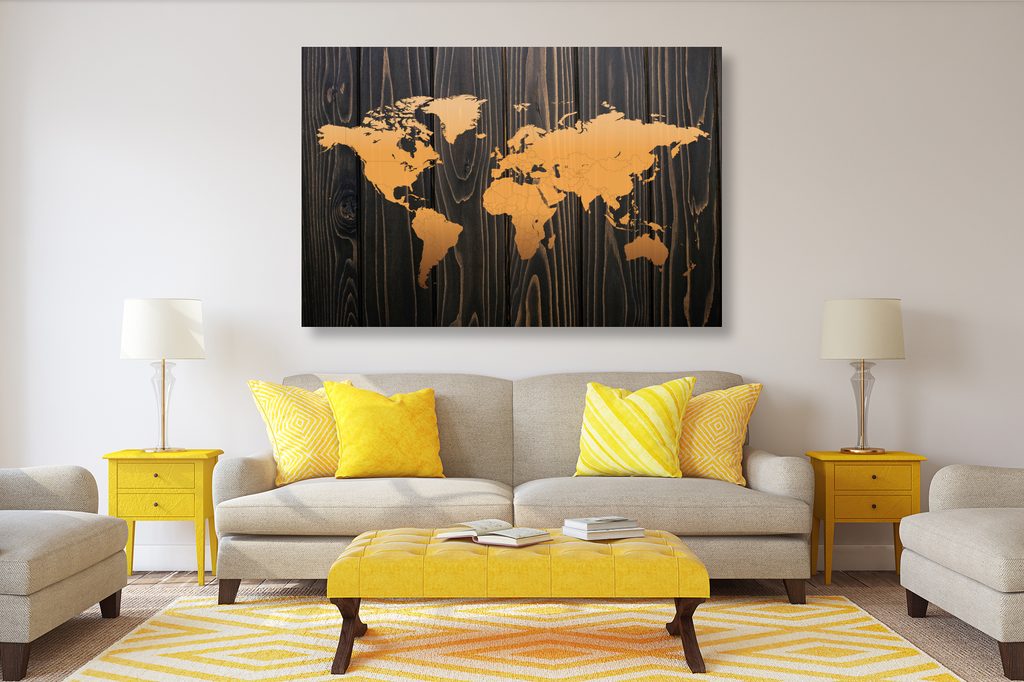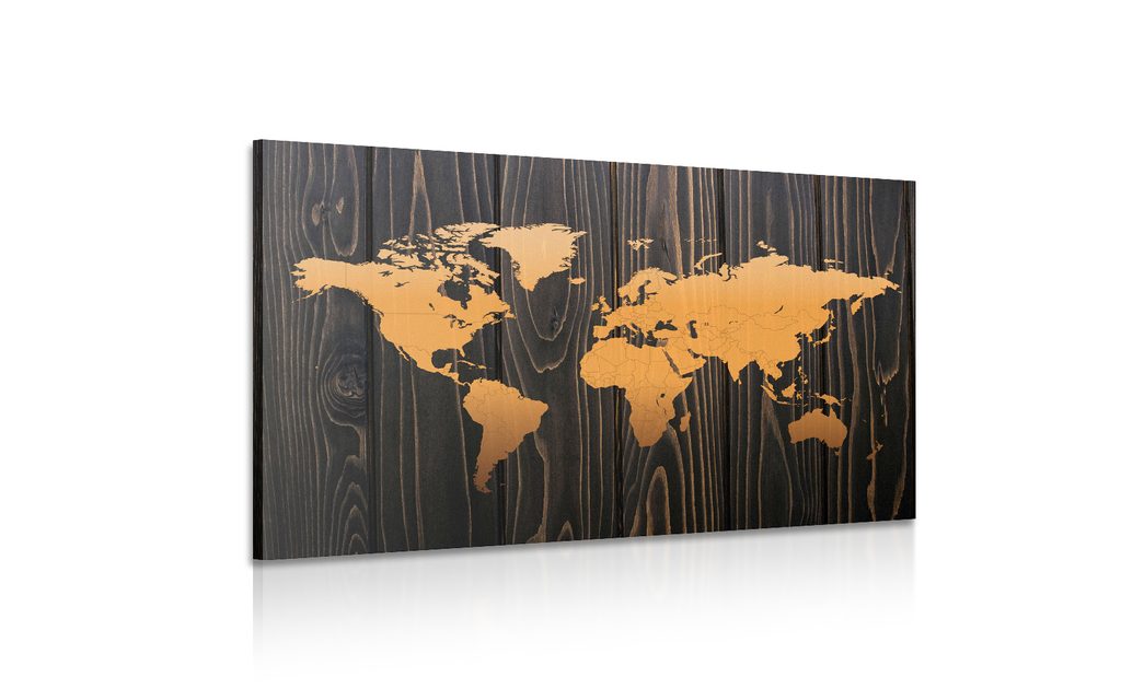 Obraz mapa sveta so symbolickými zvieratami na drevenom podklade