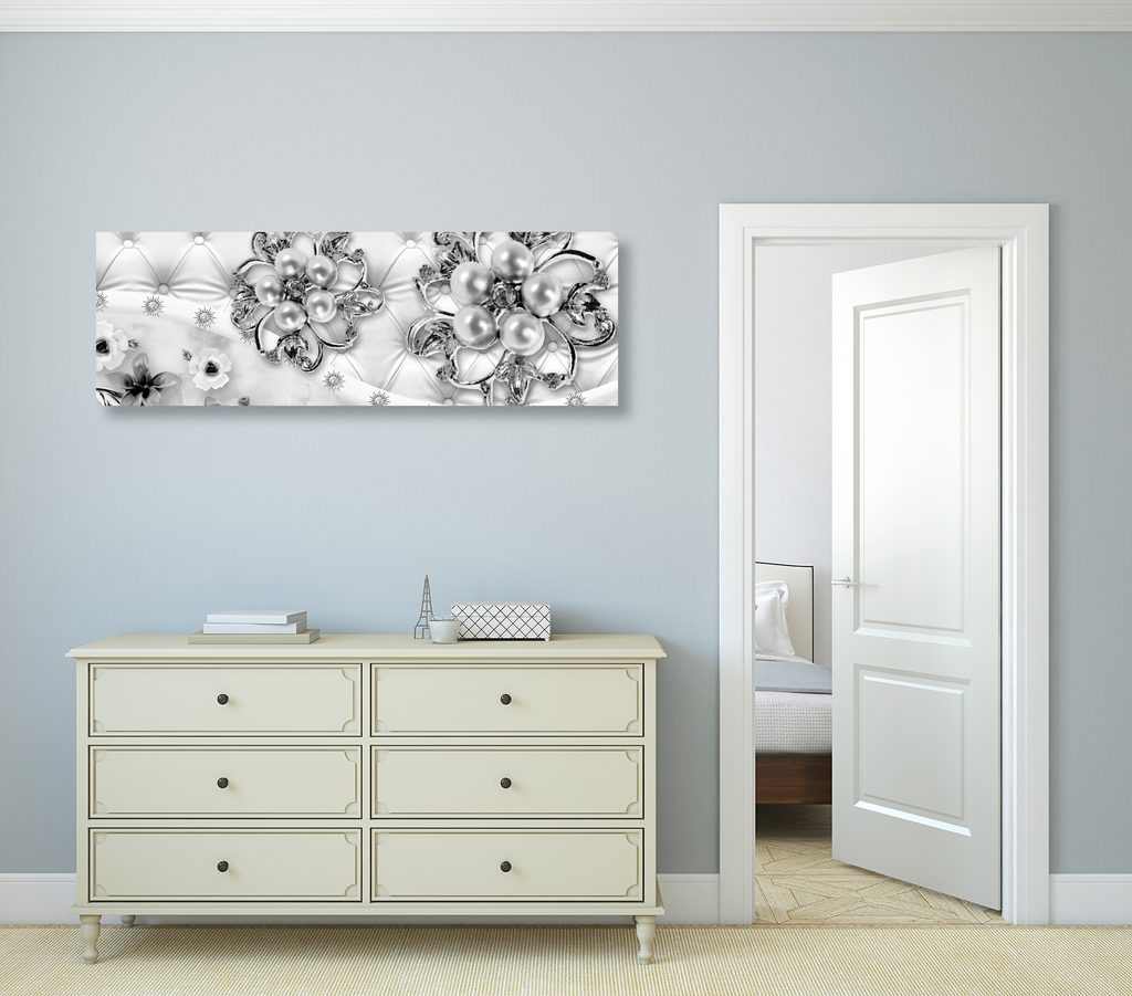 Obraz luxusné perly s kvetmi v čiernobielom prevedení