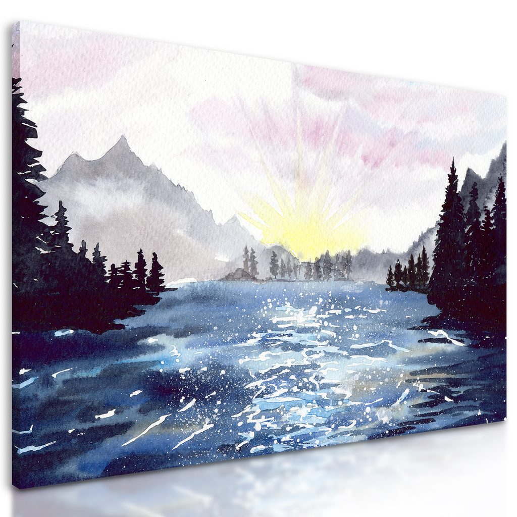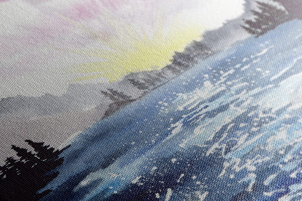 Obraz zasnežená krajina pri zapadajúcom slnku