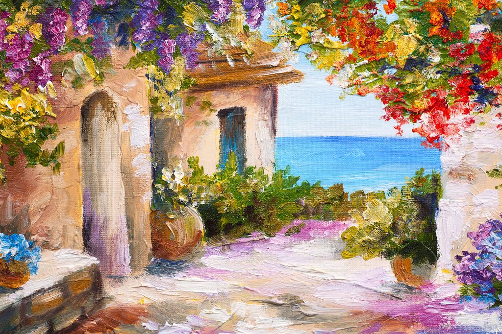 Obraz maľovaný domček pri mori