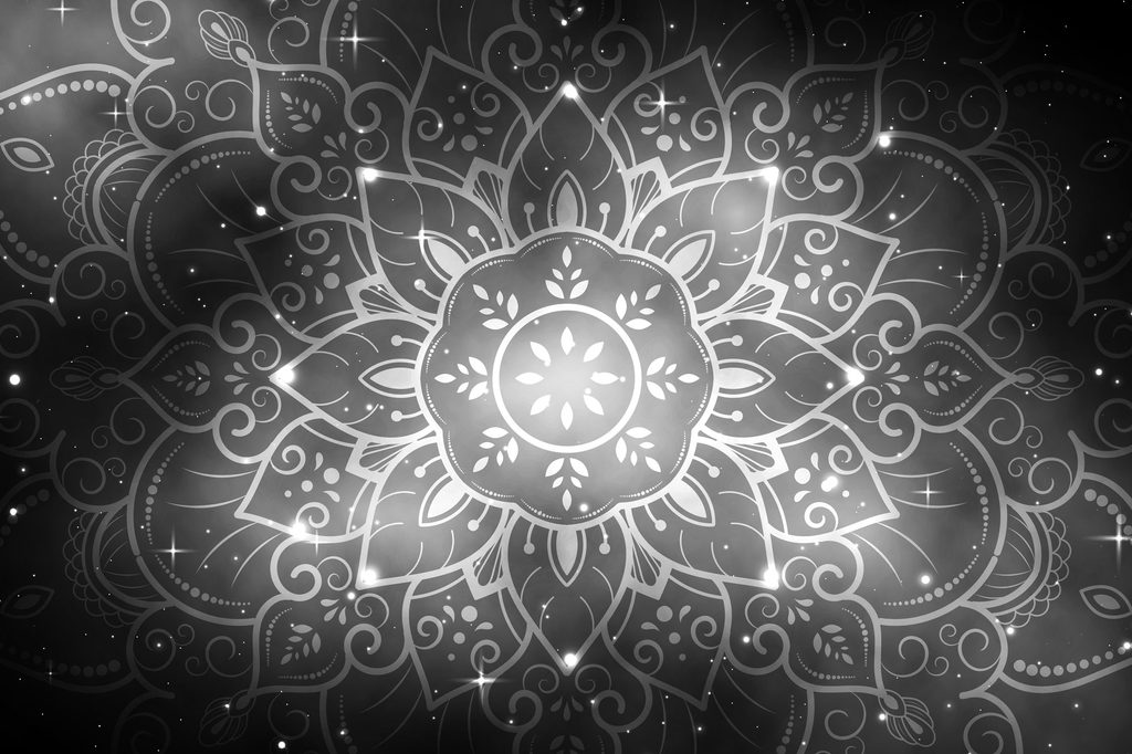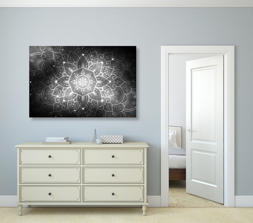 Obraz Mandala s vesmírnym pozadím v čiernobielom prevedení