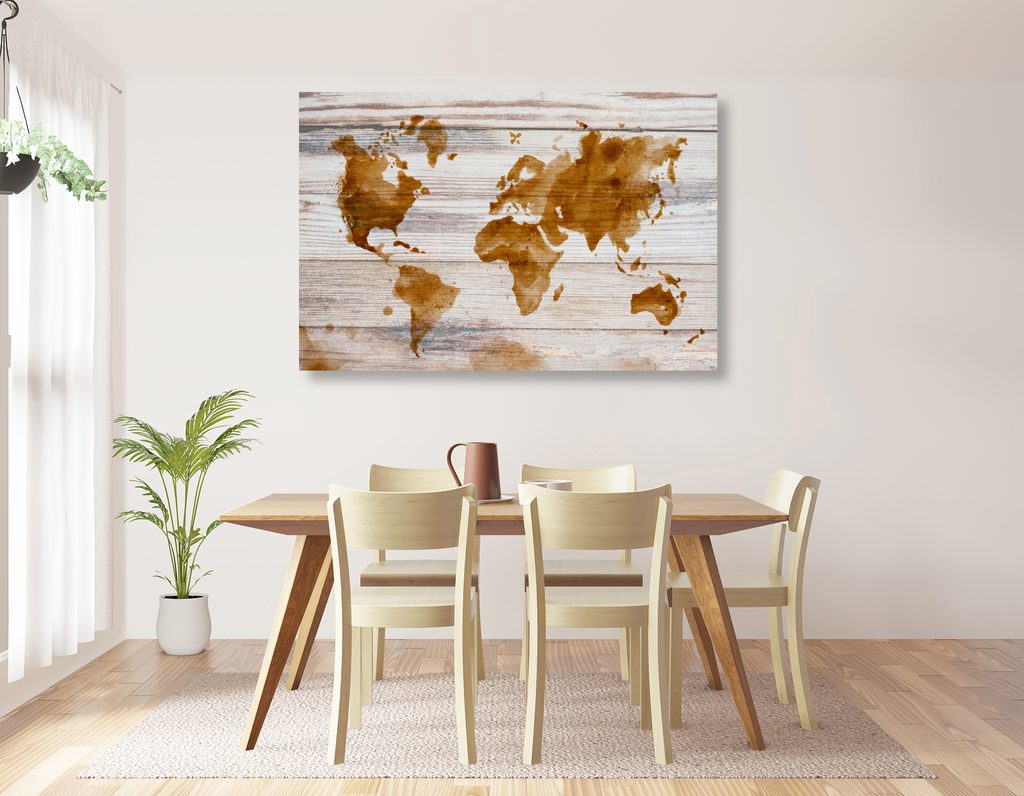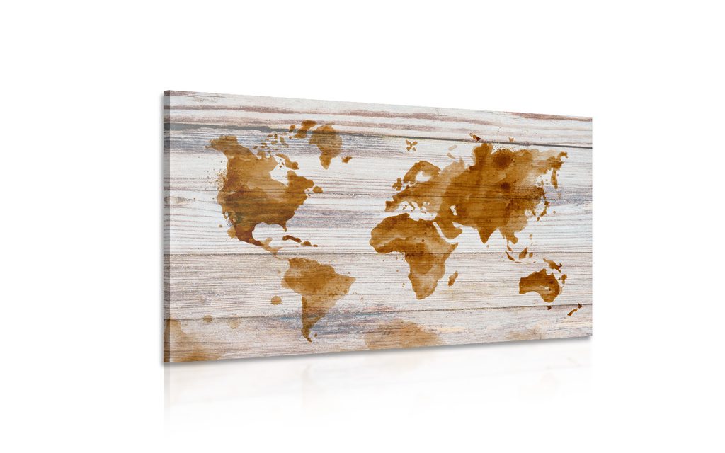 Obraz čiernobiela mapa sveta so symbolickými zvieratami na drevenom podklade
