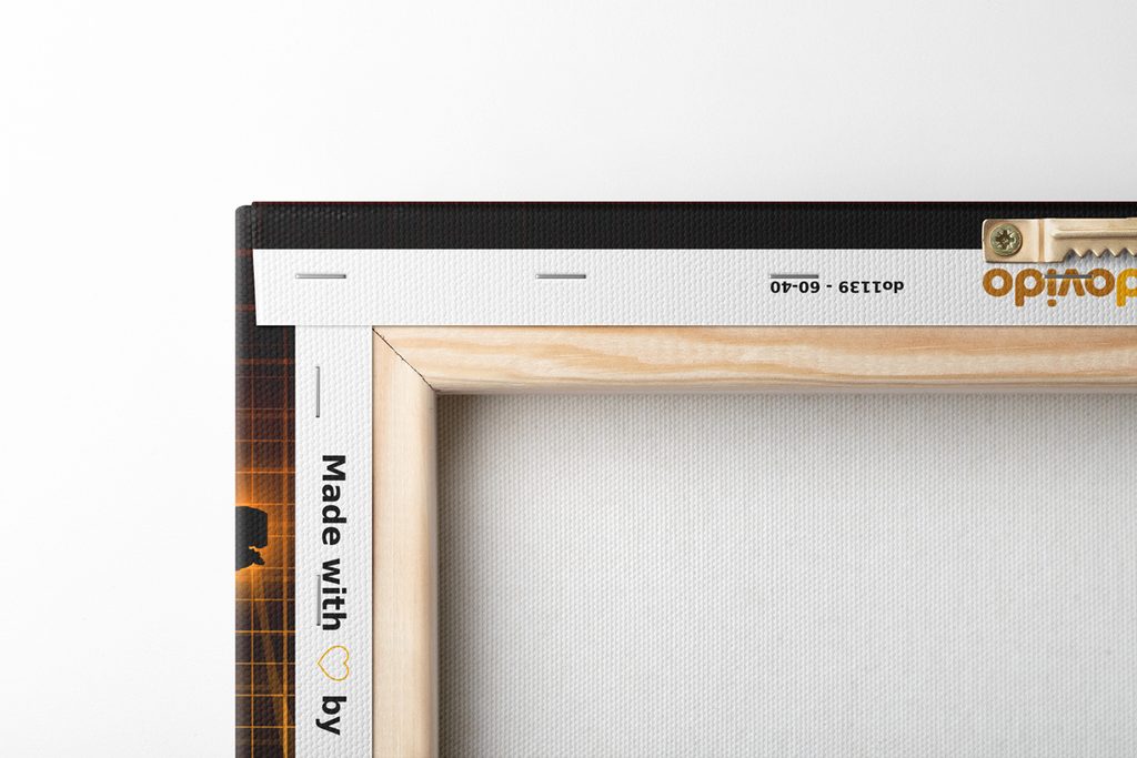 Keďže chceme, aby obraz na vašej stene vyzeral dokonalo, zameriavame sa na detaily. Preto je plátno dôkladne napnuté na rám, ktorý je z kvalitného dreva. Použitý rám je vyrábaný z rámarských líšt, ktoré sú vhodné na výrobu obrazov. Netreba zabudnúť ani na to, že na zadnej strane sú nahusto umiestnené spony. Spolu s obrazmi obdržíte 1 až 2 ks závesov, ktoré sú umiestené na zadnej strane, podľa toho, aký rozmer obrazu si zvolíte. Pre obrazy, ktorých šírka je nad 120 cm je na zosilnenie rámu vsadená drevená priečka.