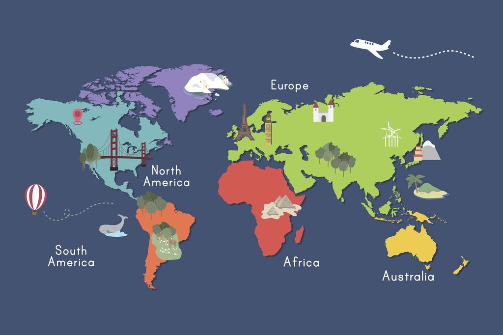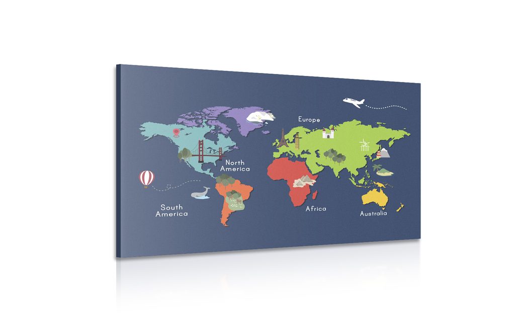 Obraz mapa sveta s kreslenými dominantami