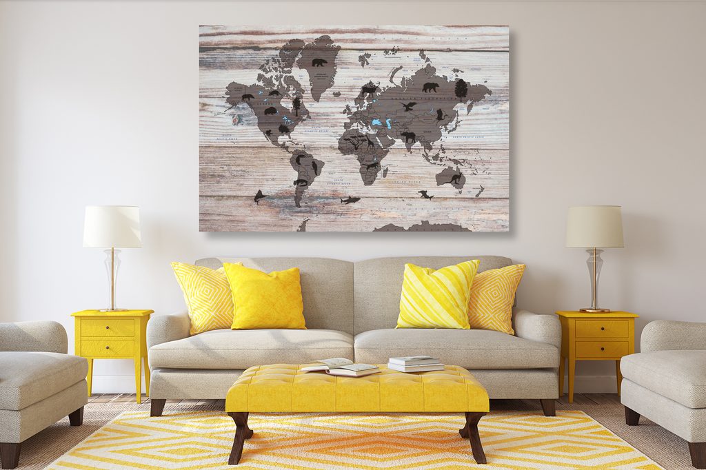 Obraz mapa sveta so symbolickými zvieratami na drevenom podklade