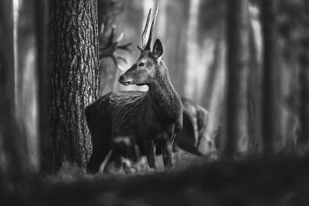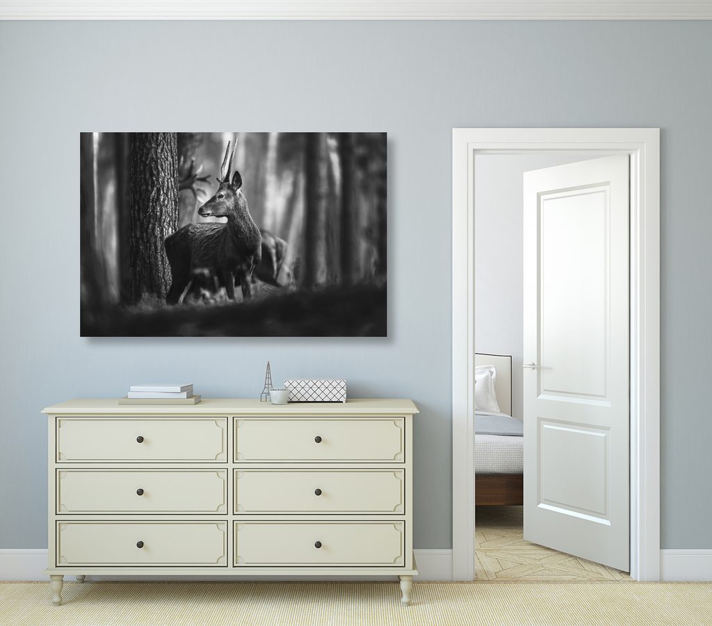 Obraz mladý jeleň uprostred lesa v čiernobielom prevedení