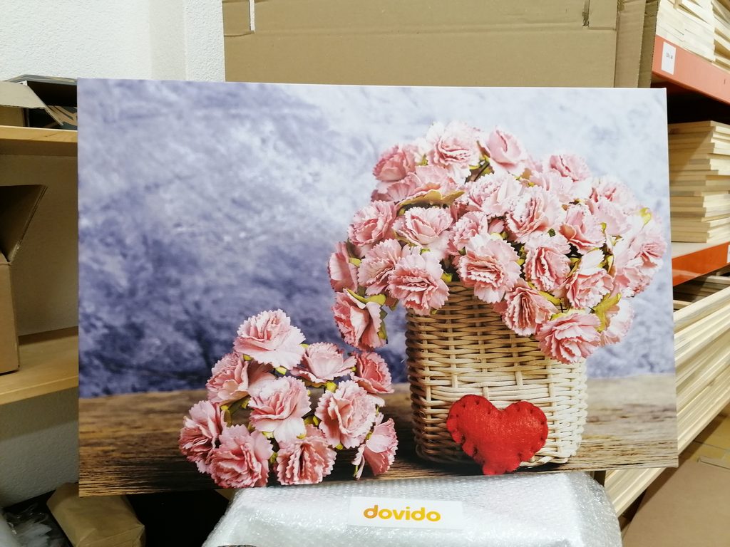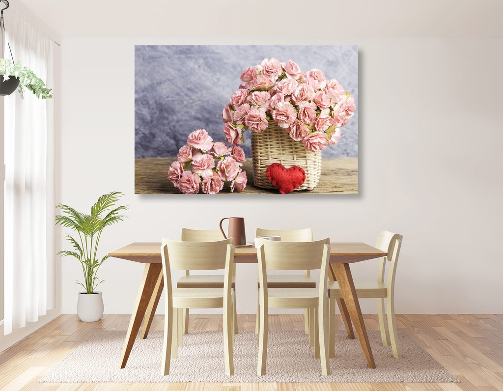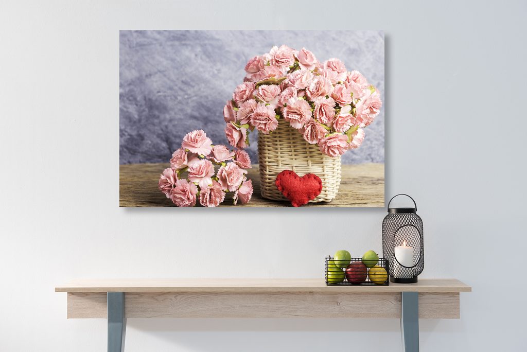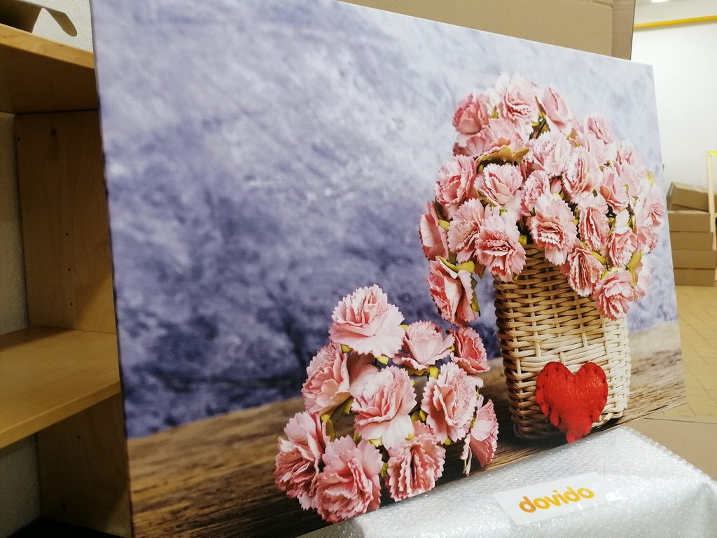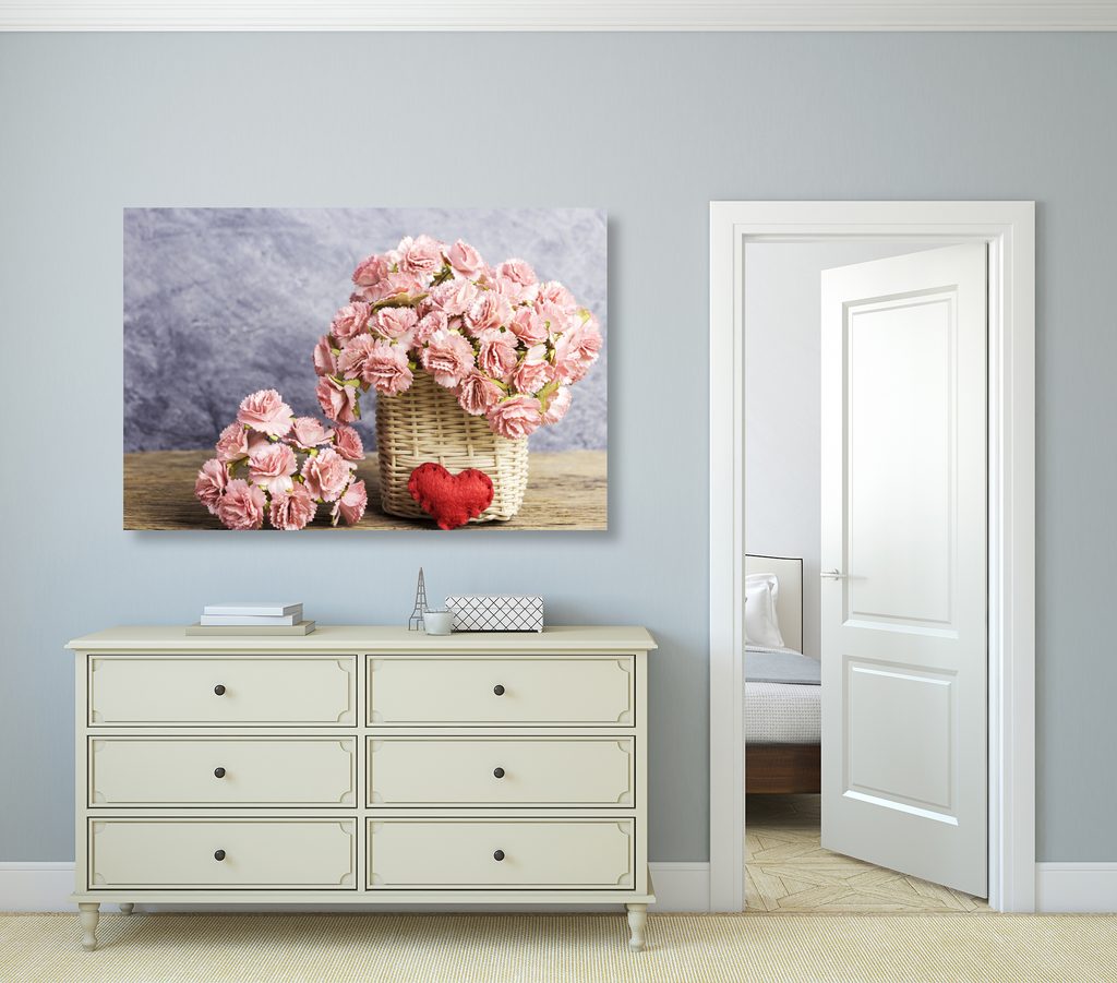 Obraz nádherná kytica karafiátov v prútenom košíku