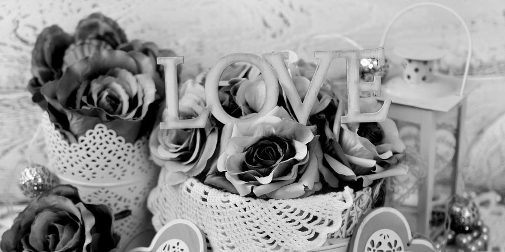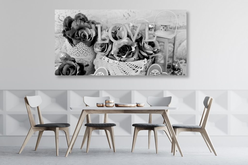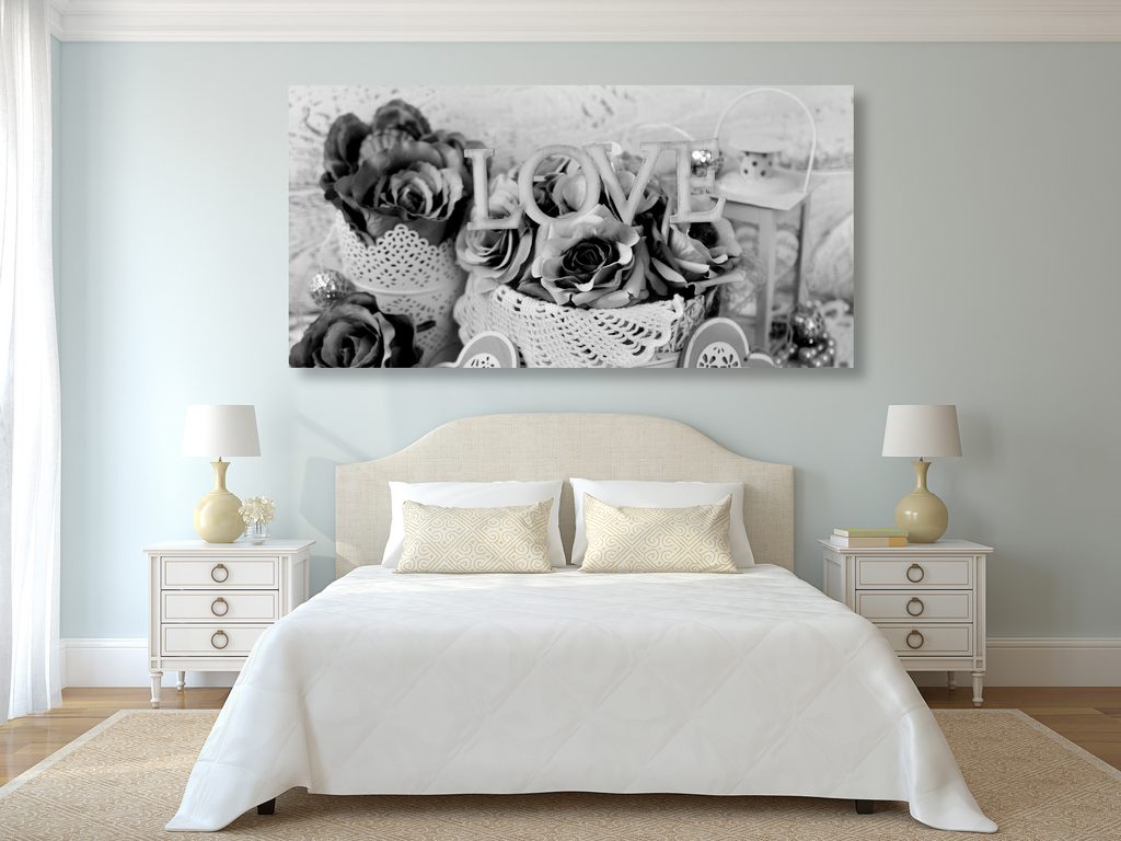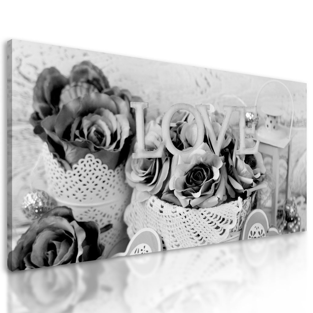 Obraz nádherné romantické zátišie s nápisom love v čiernobielom prevedení