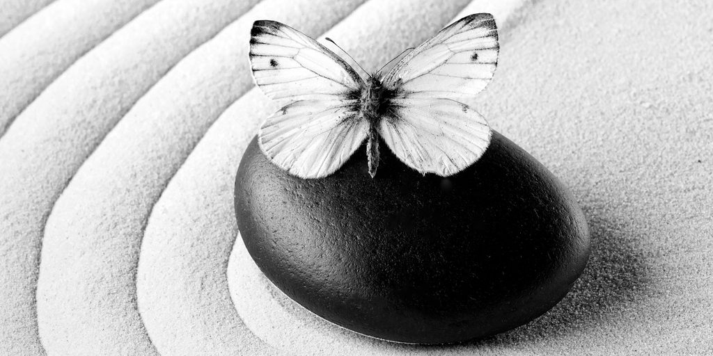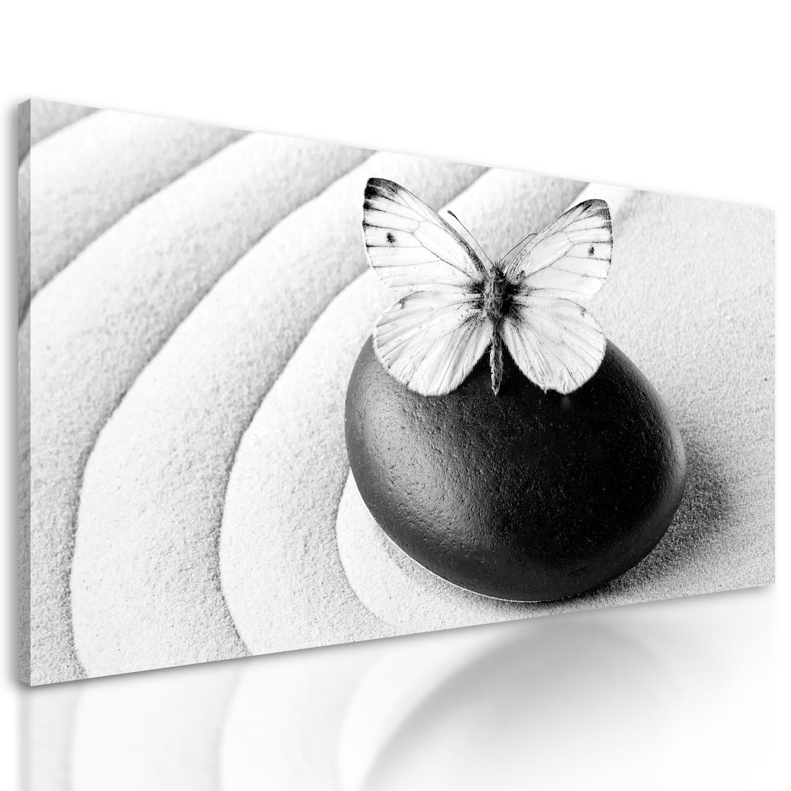 Obraz nádherný biely motýľ na Zen kameni v čiernobielom prevedení