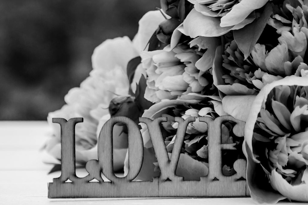 Obraz nápis Love s pozadím tvoreným pivóniami v čiernobielom prevedení