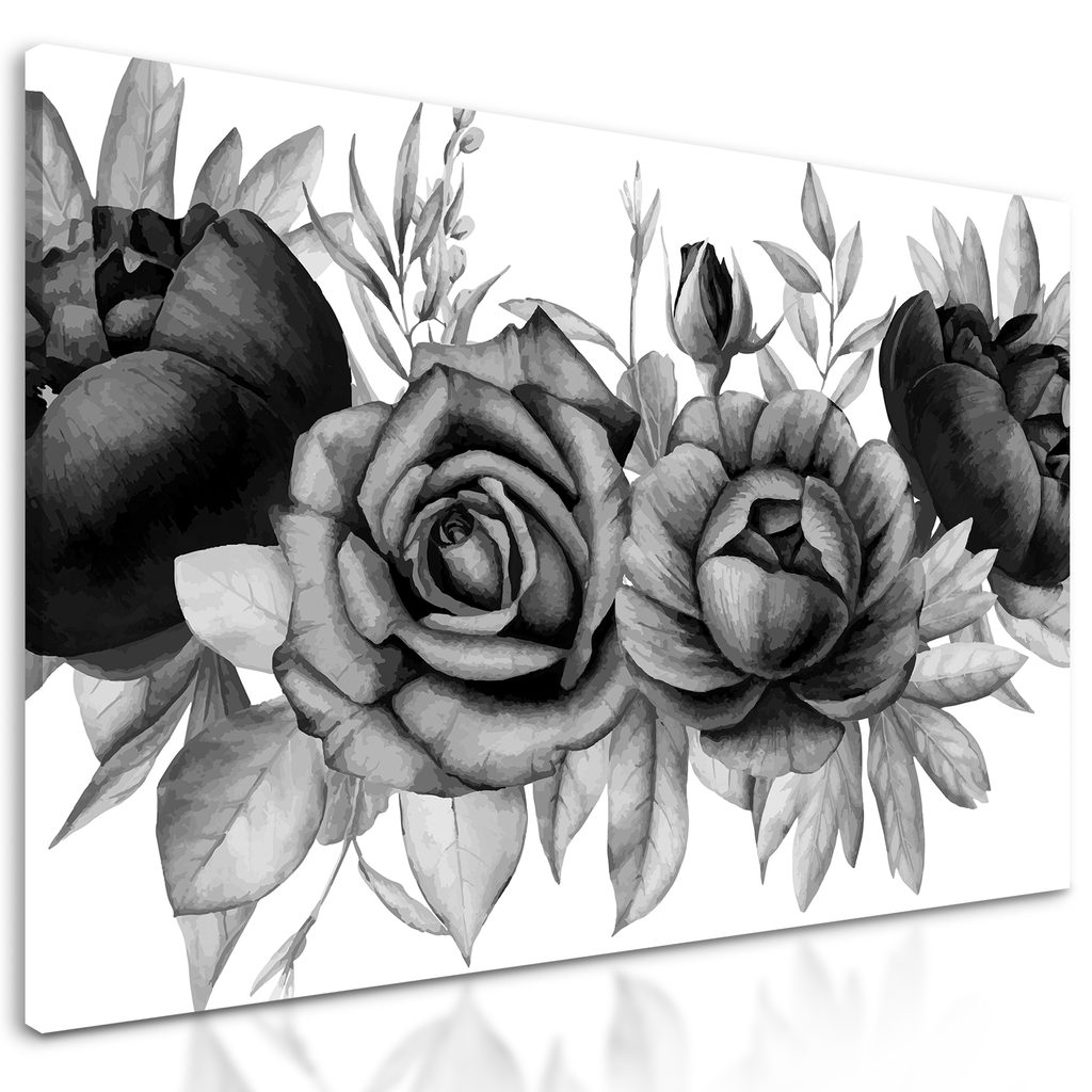 Obraz nežné splynutie ruží a listov v čiernobielom prevedení
