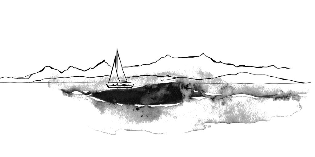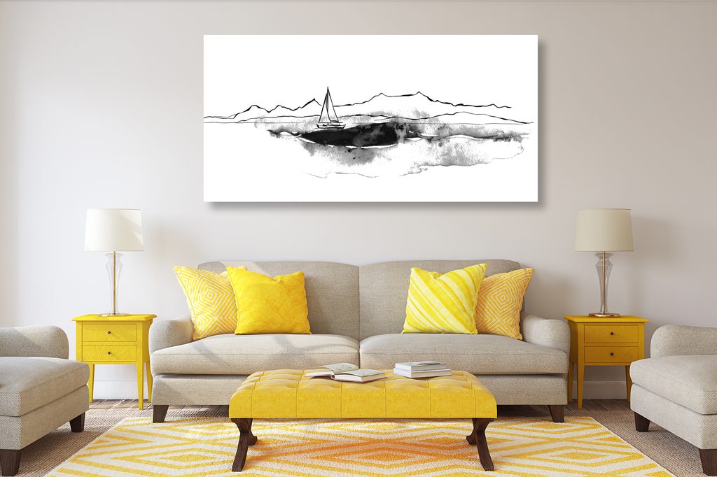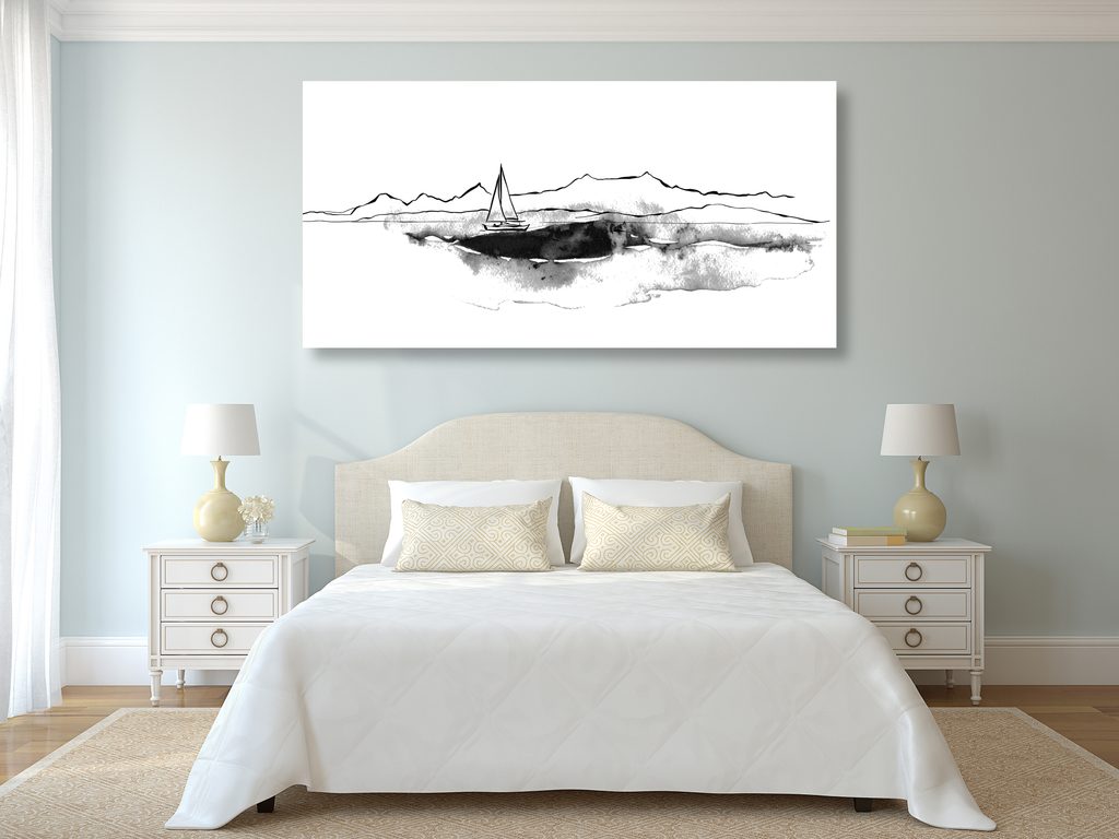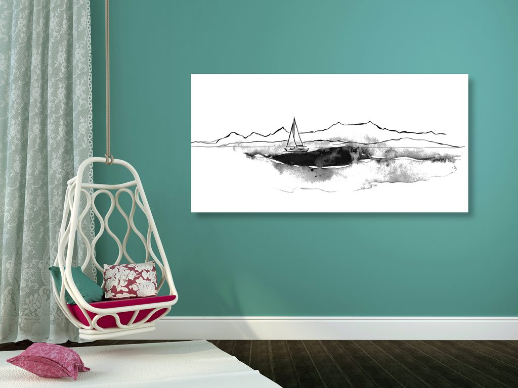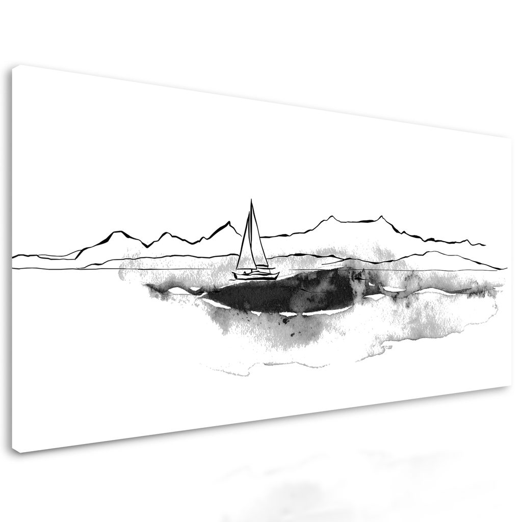 5-dielny obraz loďka na šírom mori v čiernobielom prevedení