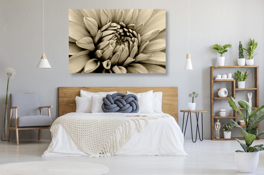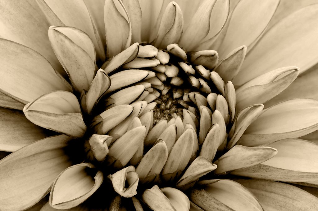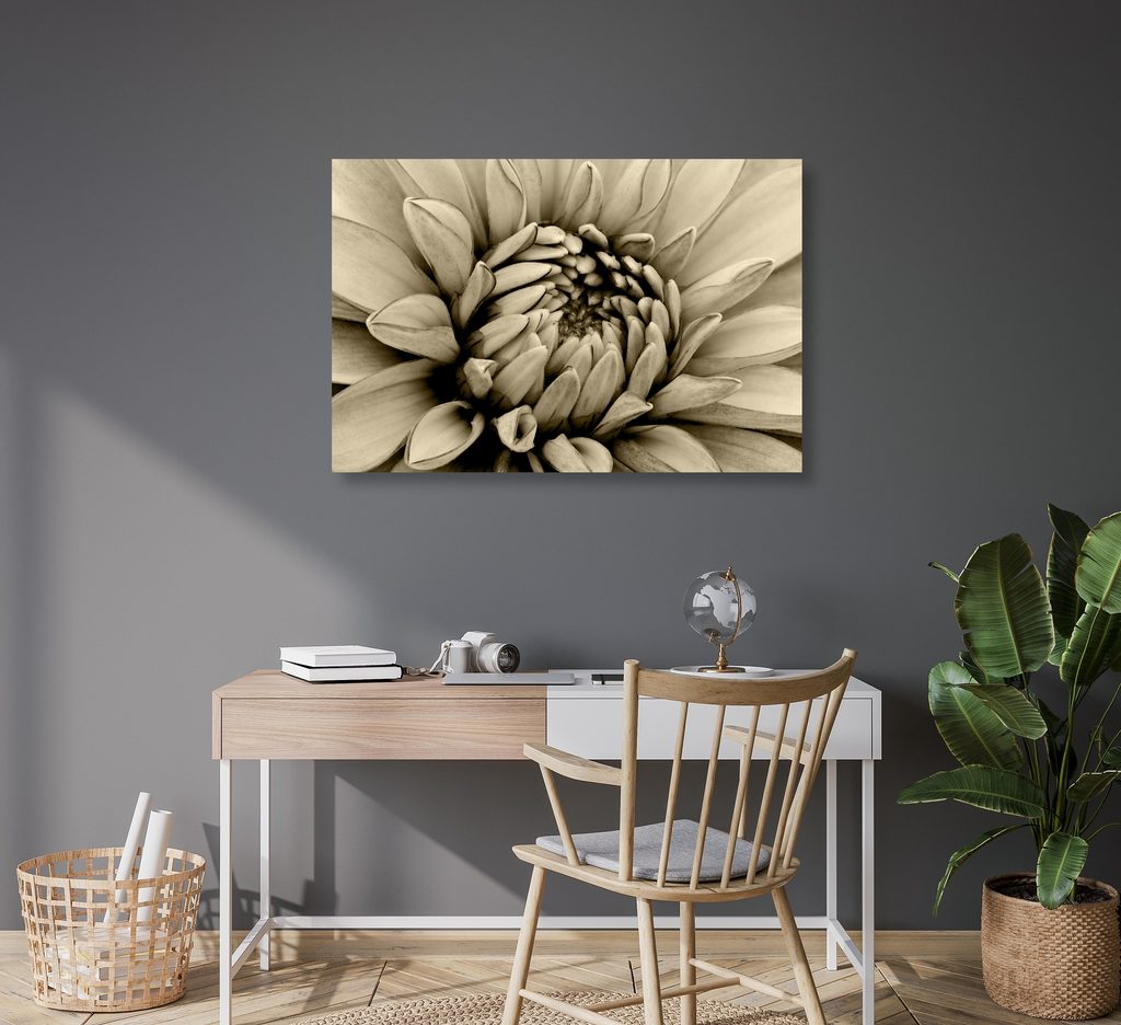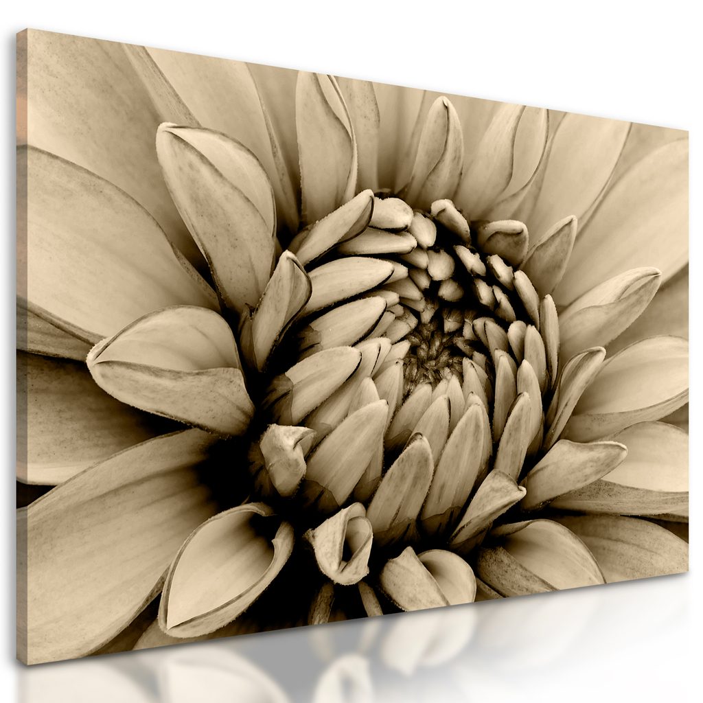 Obraz perfektný detail na kvet dálie v sépiovom prevedení