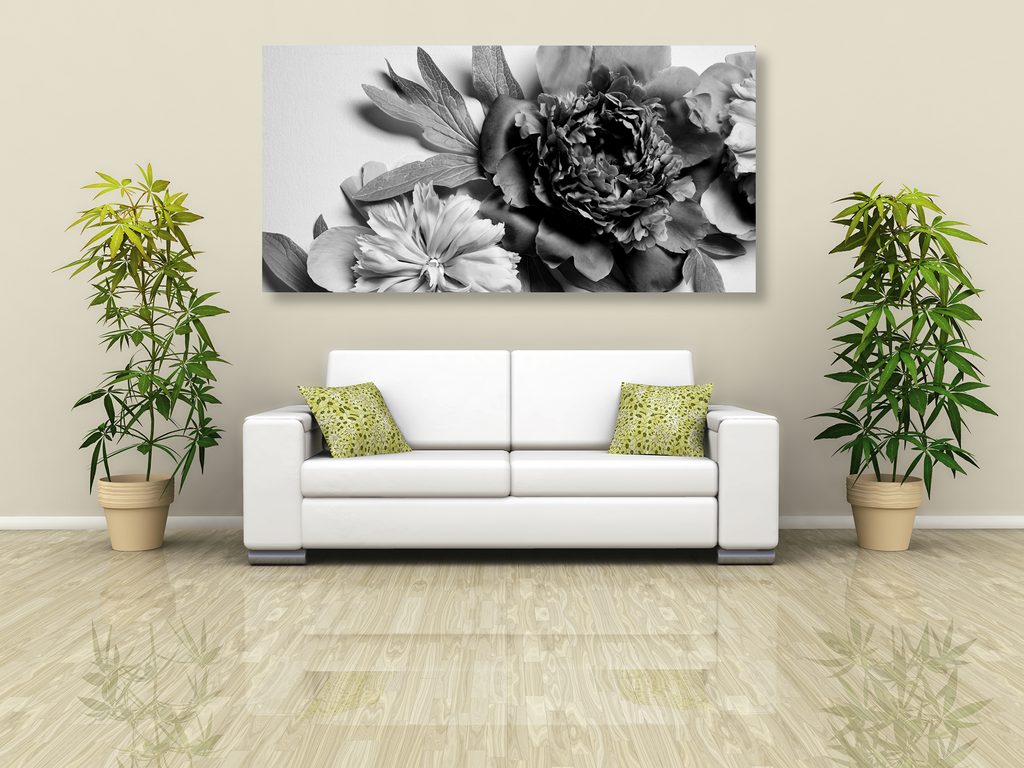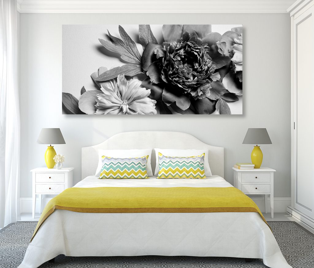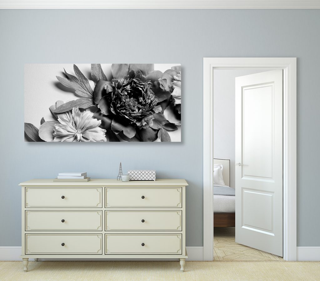 Obraz pôvabné pivónie v čiernobielom prevedení