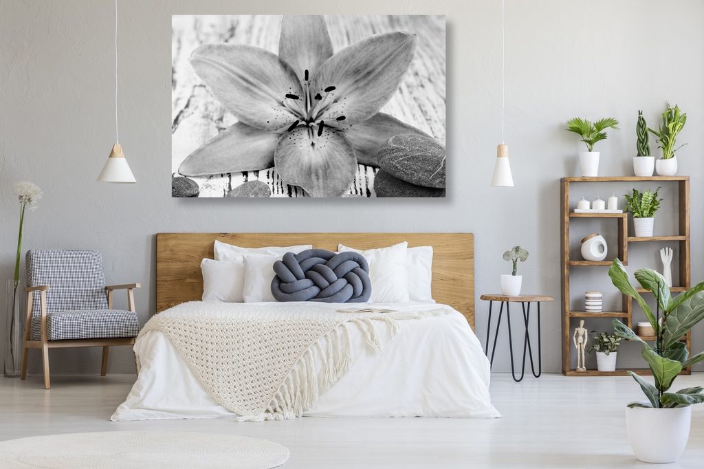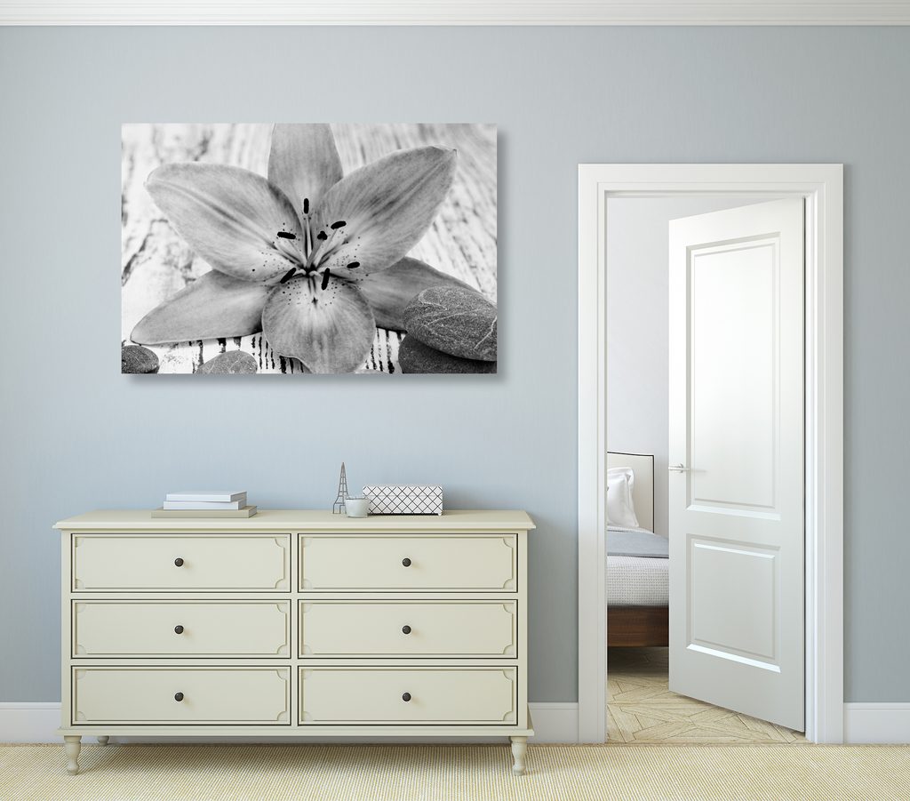 Obraz zátišie s nápisom Home v čiernobielom prevedení