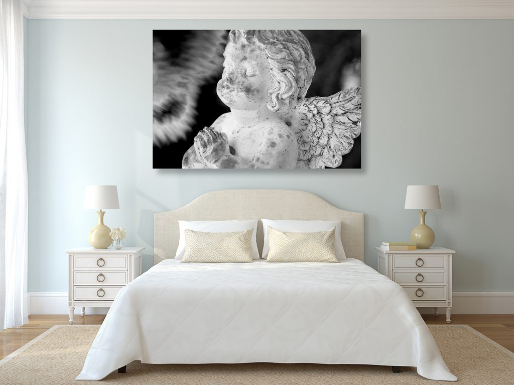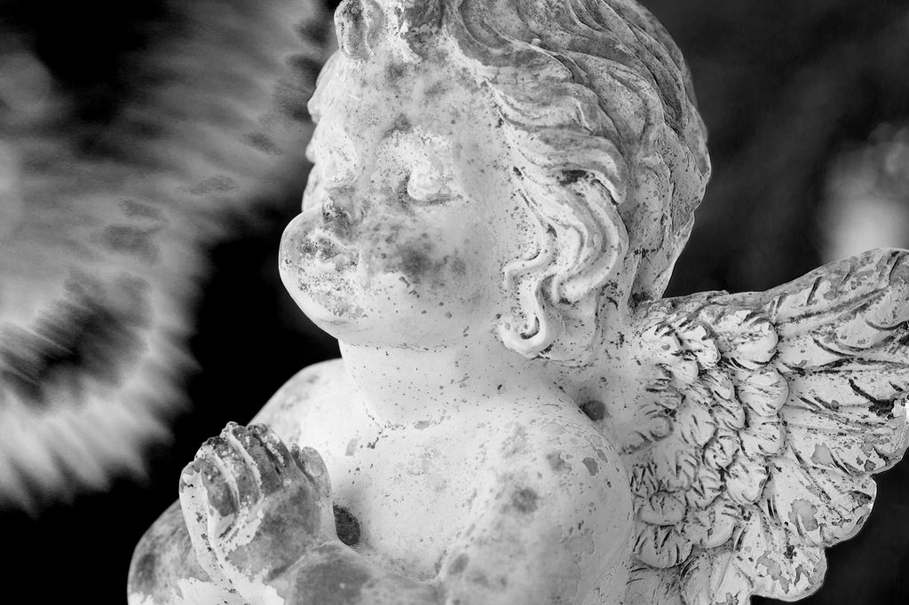Obraz soška anjela v čiernobielom prevedení