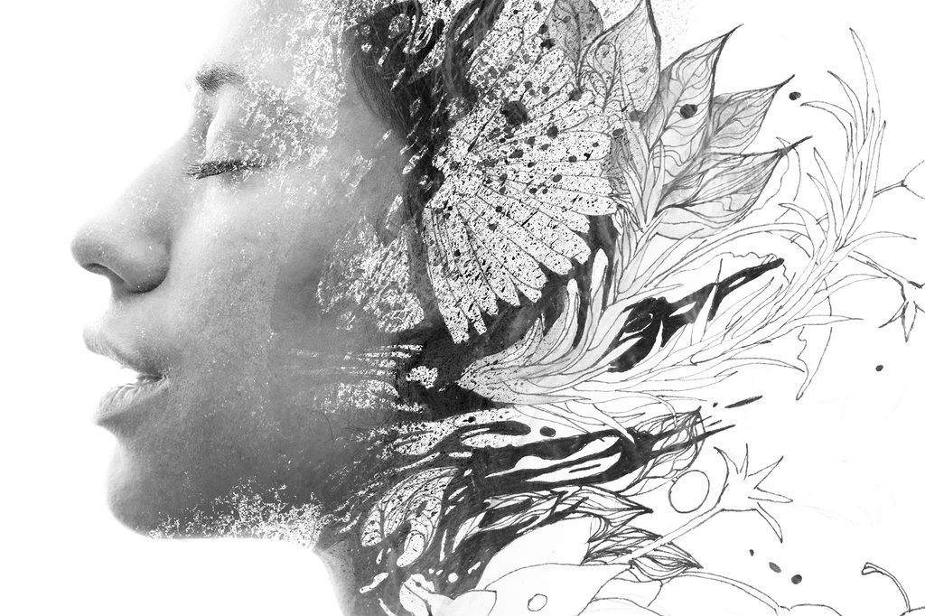 Obraz splinutie ženy a prírody v čiernobielom prevedení