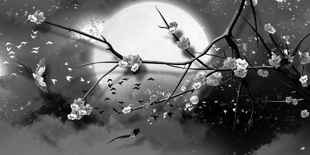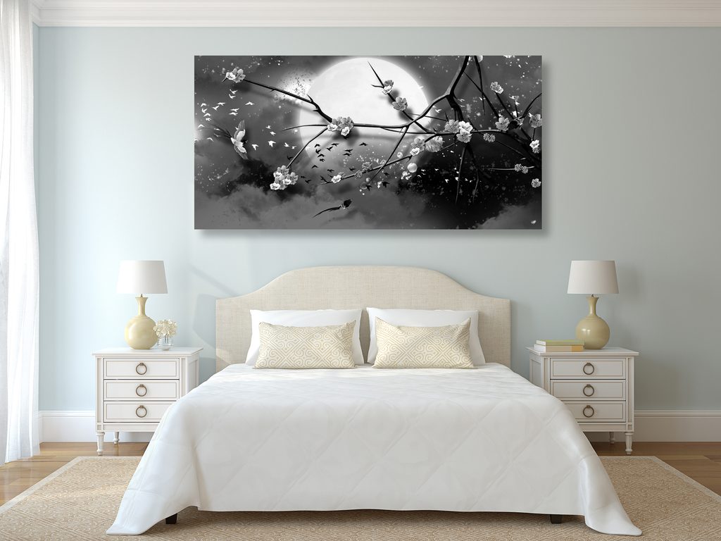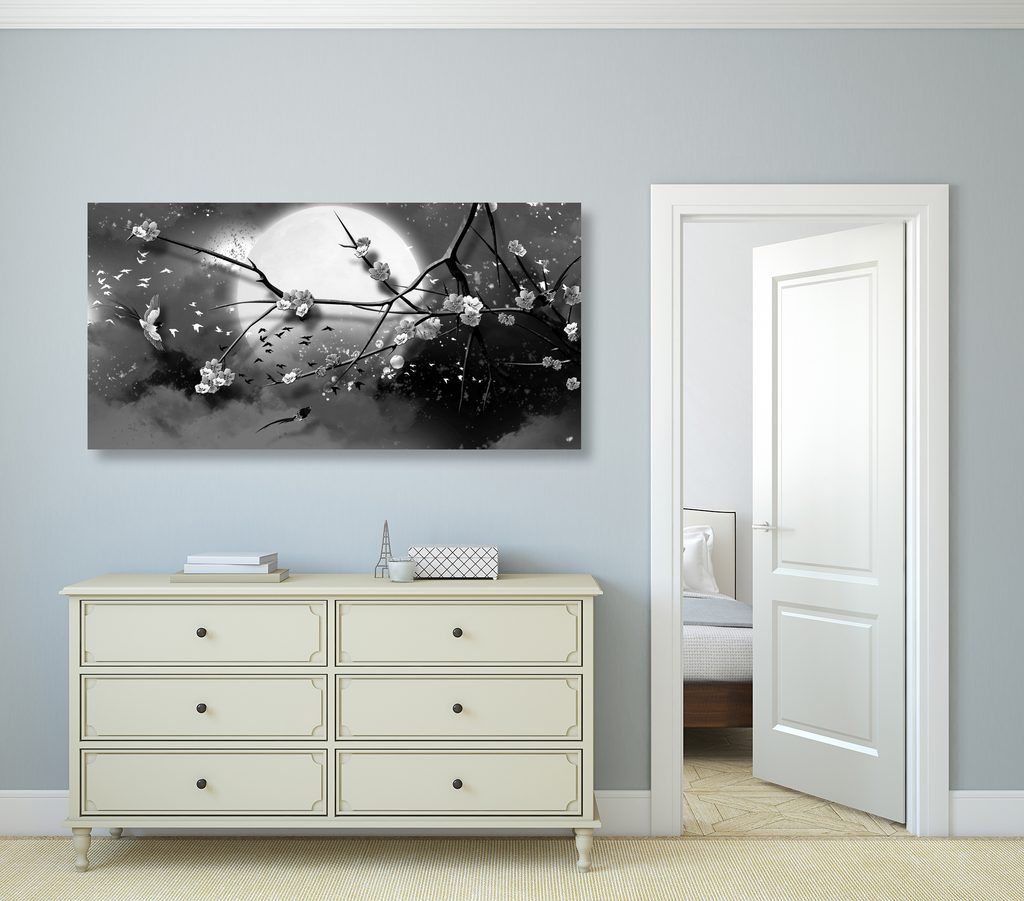 Obraz vtáčiky lietajúce za splnu mesiaca v čiernobielom prevedení