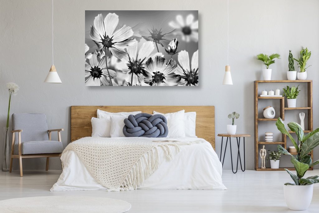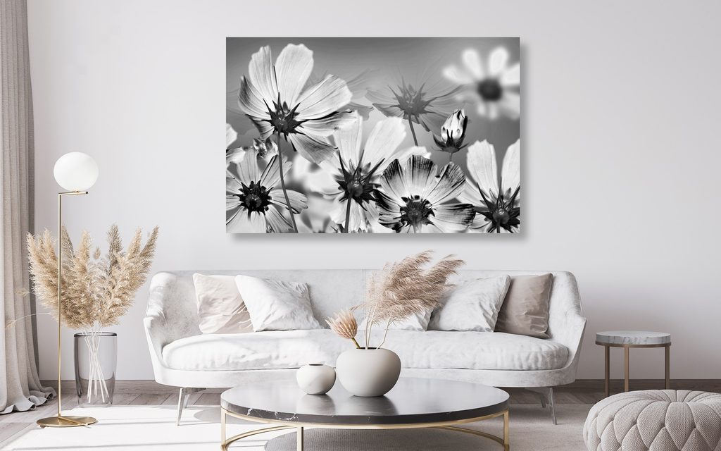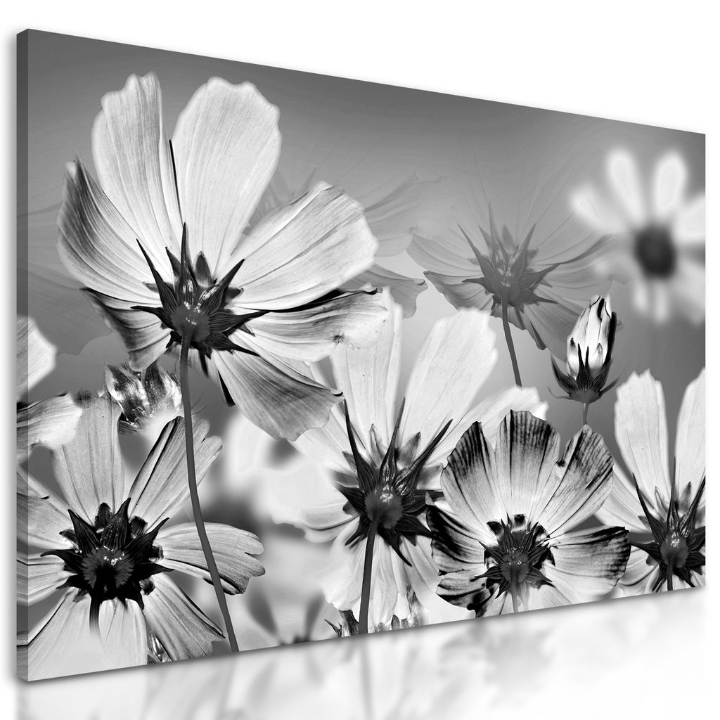 Obraz lúka plná kvetov v čiernobielom prevedení