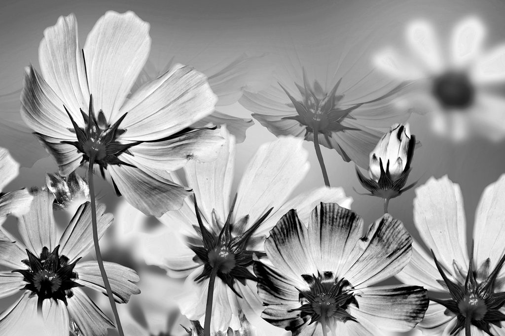 Obraz záhrada rozkvitnutých kvetov v čiernobielom prevedení