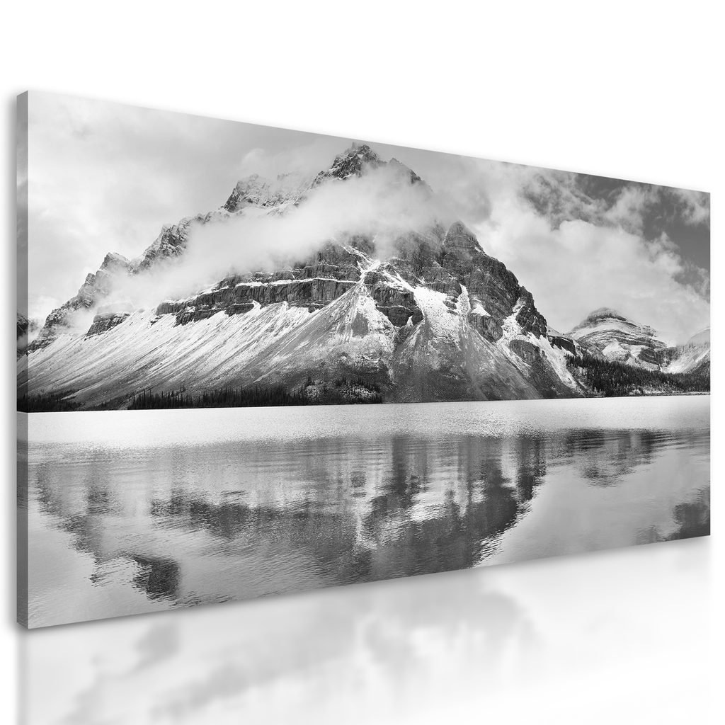 Obraz zamrznuté pleso pod majestátnou horou v čiernobielom prevedení