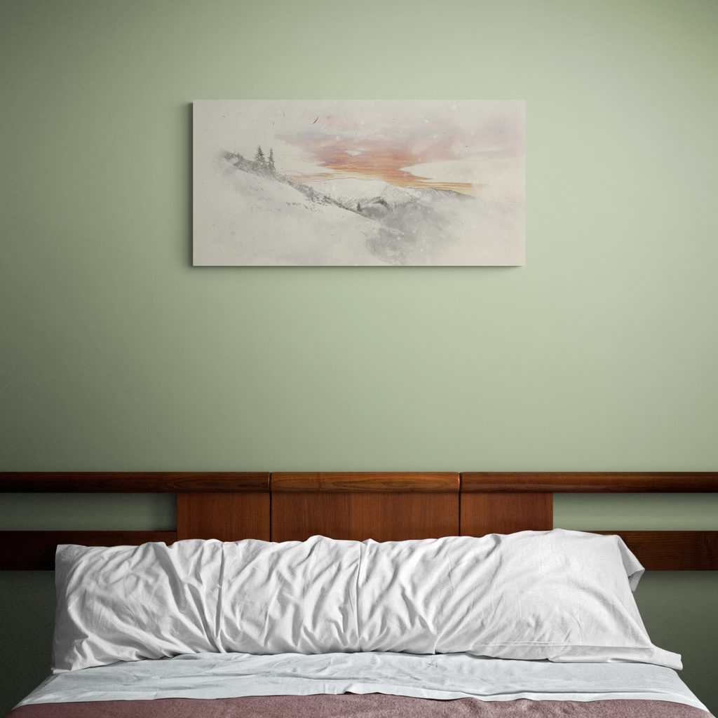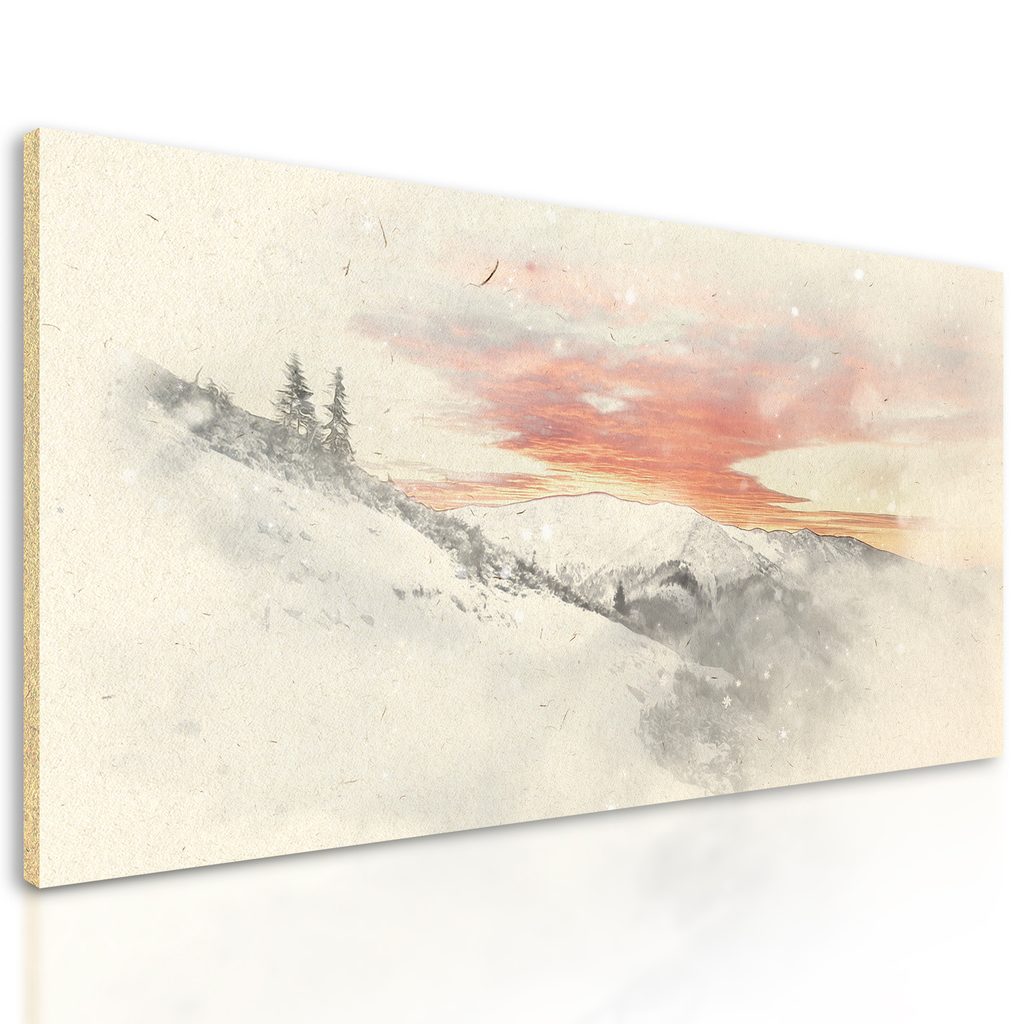 Obraz zasnežená krajina pri zapadajúcom slnku