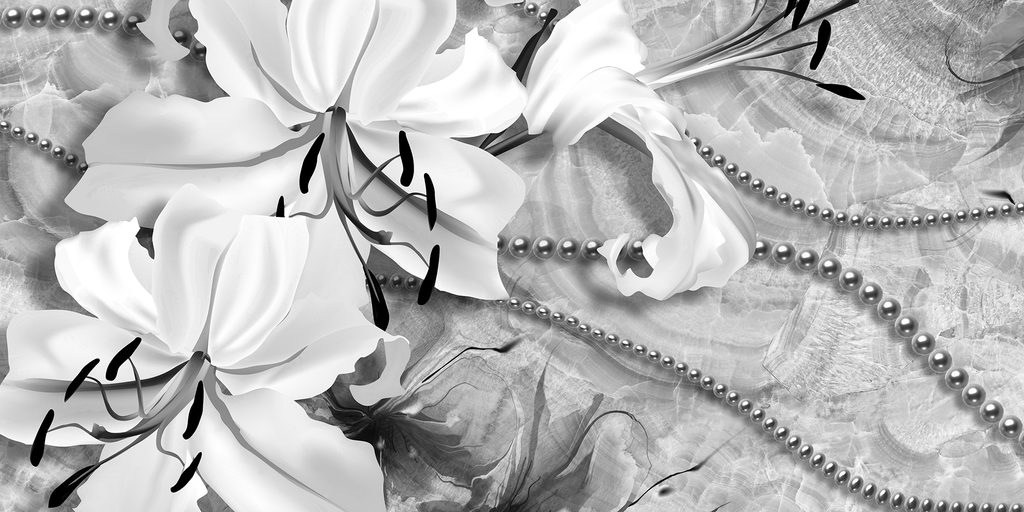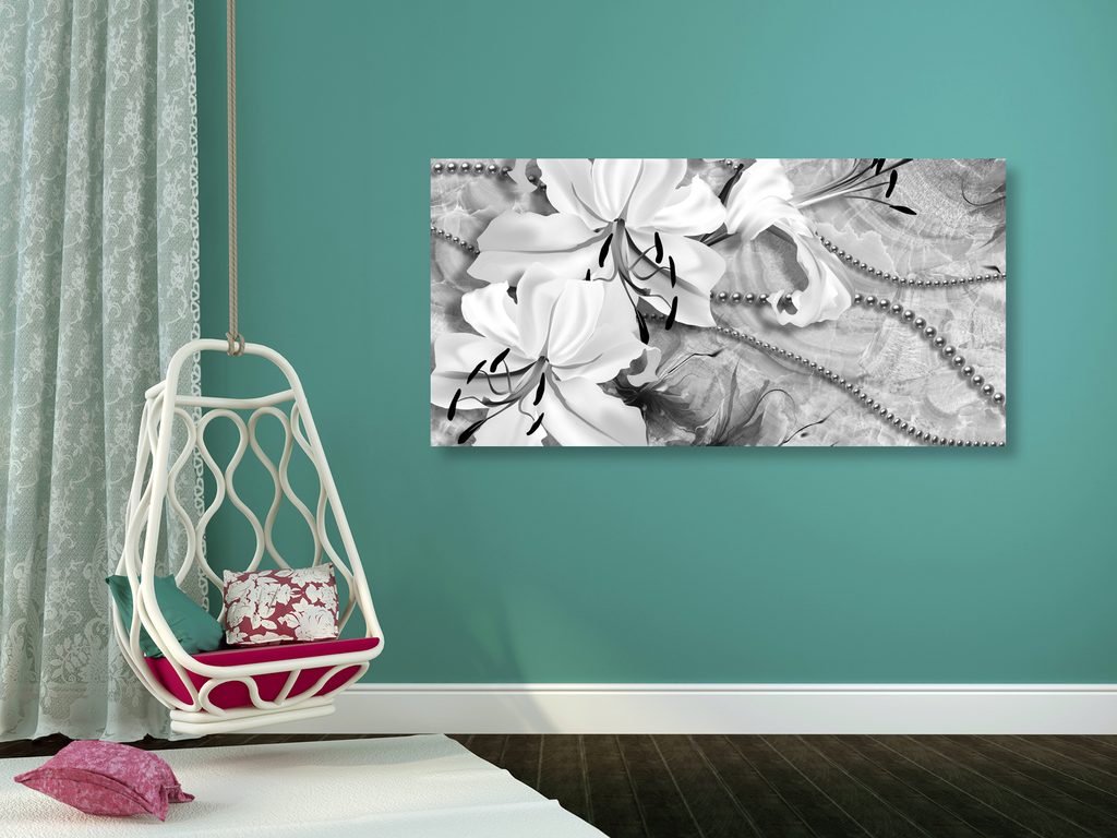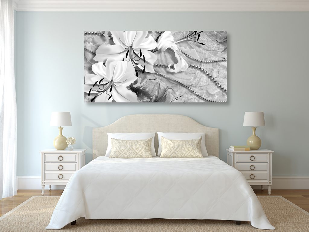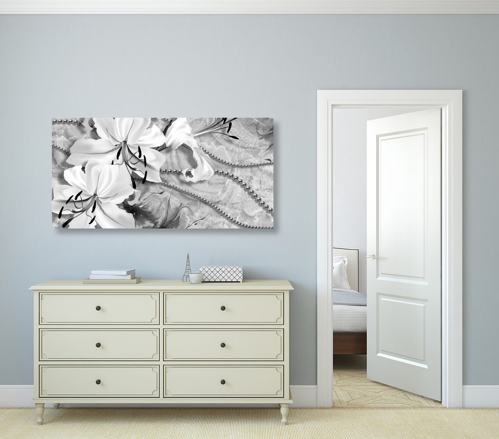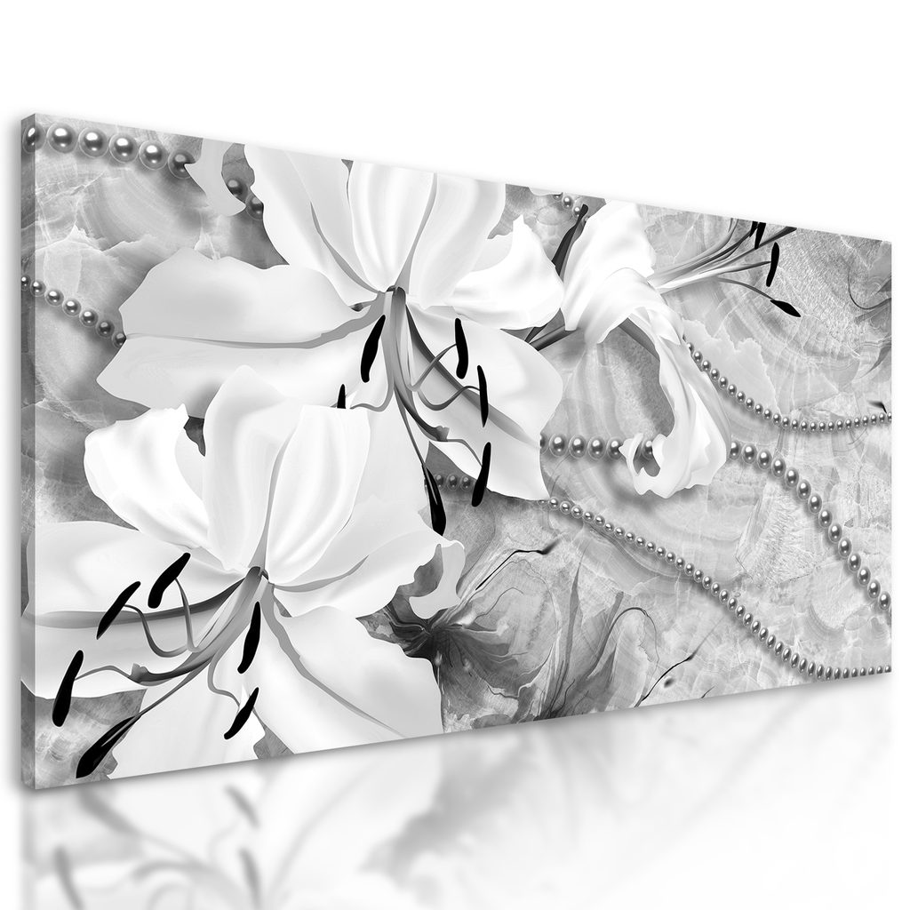 Obraz zátišie s ľáliami a perlami v čiernobielom prevedení