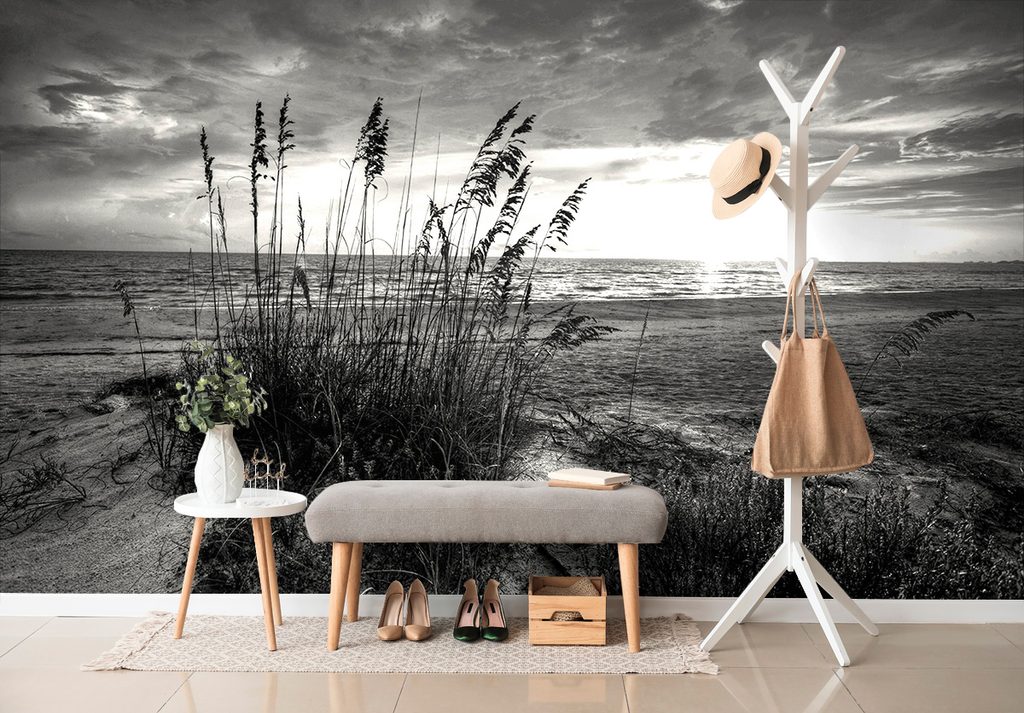 Originálna čiernobiela samolepiaca fototapeta západ slnka z pláže