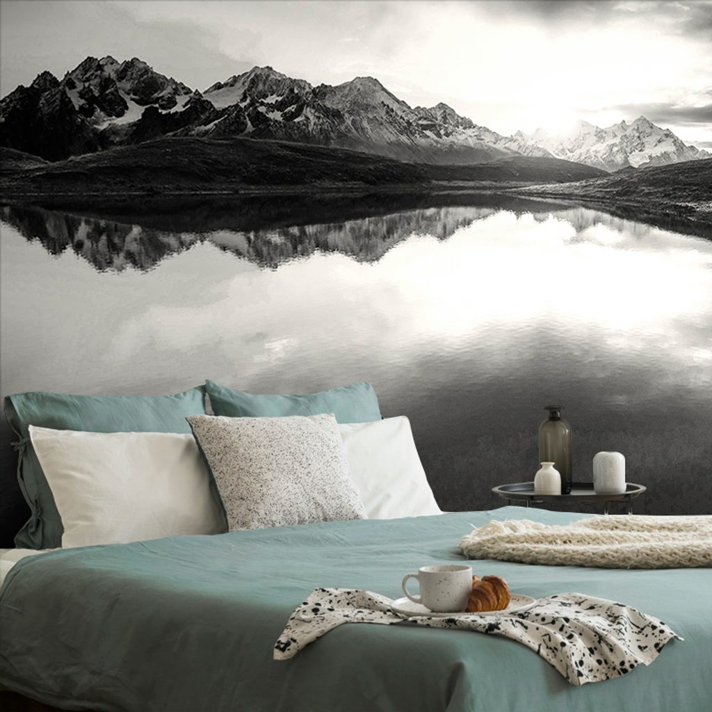 Samolepiaca fototapeta čiernobiely odraz západu slnka v horskom jazere