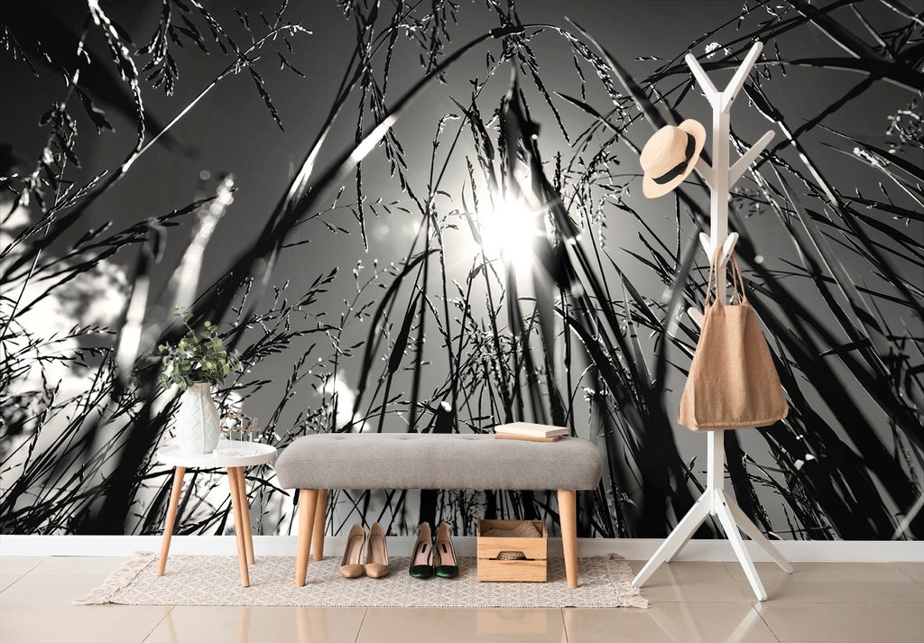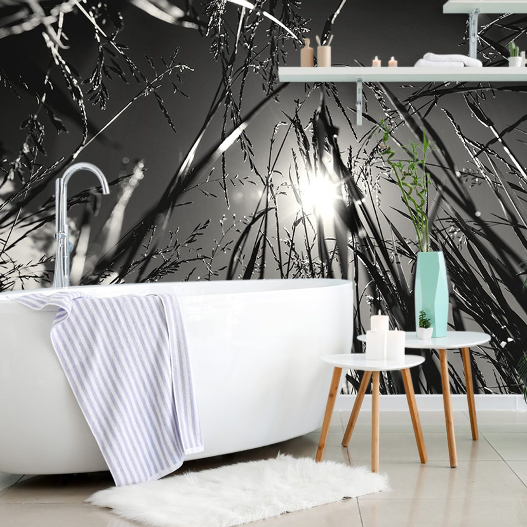 Samolepiaca fototapeta čiernobiely pohľad na slnko z trávy