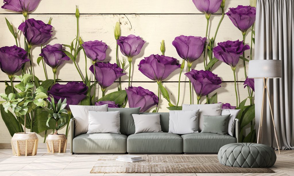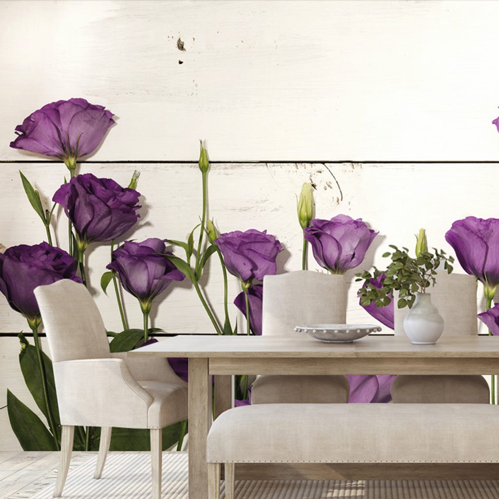 Samolepiaca fototapeta fialové kvety na drevenom pozadí
