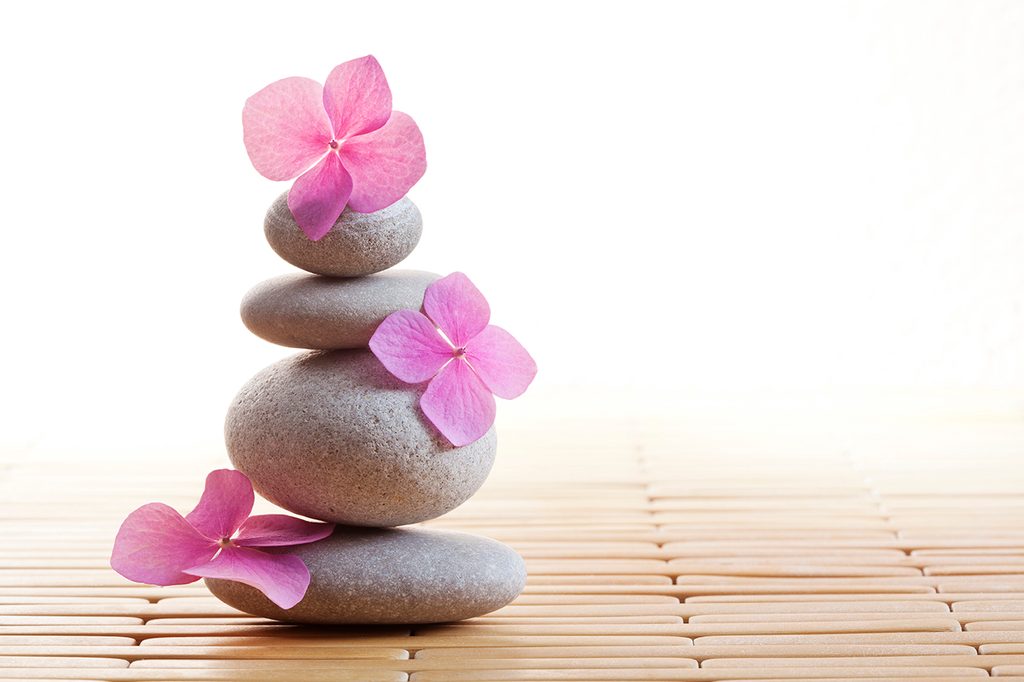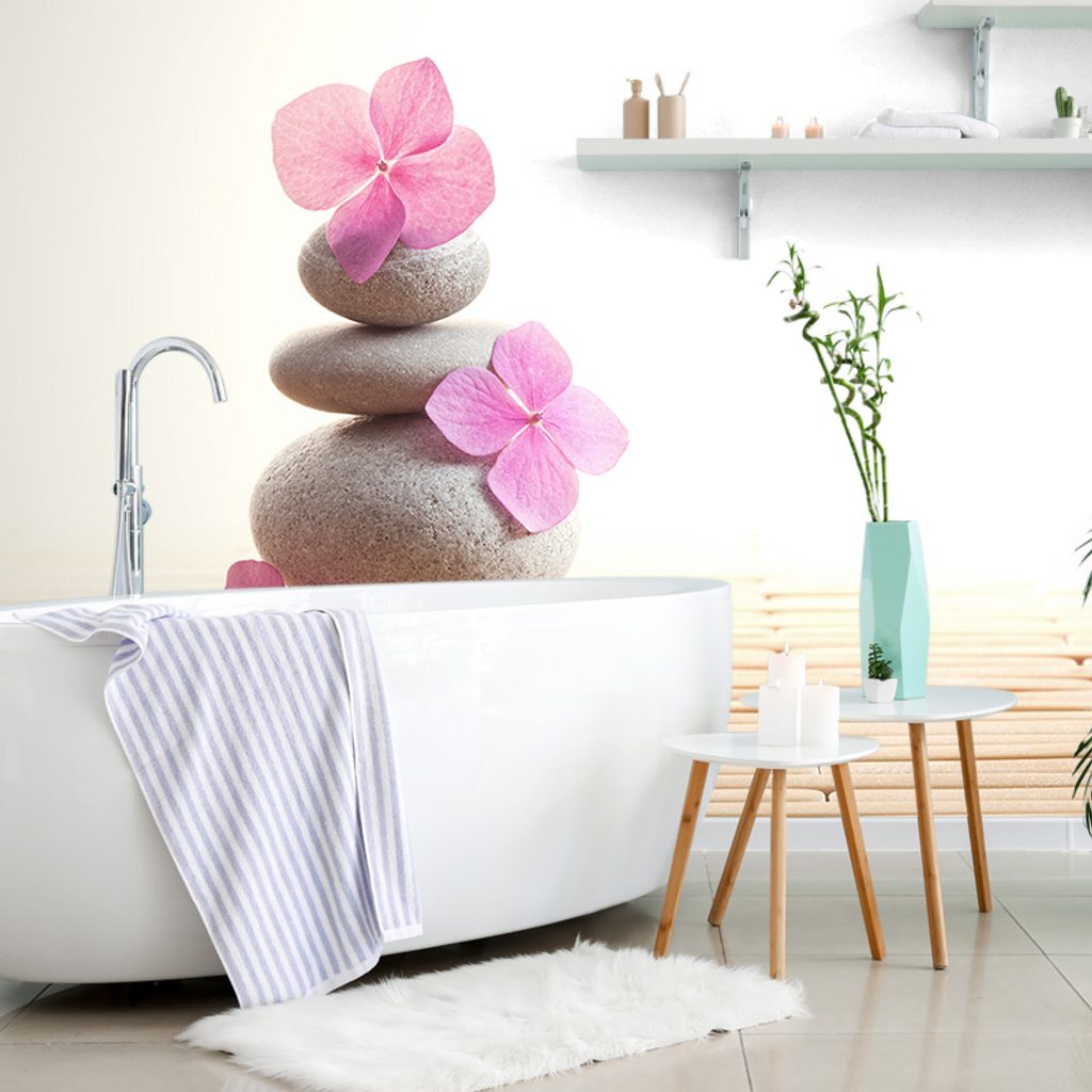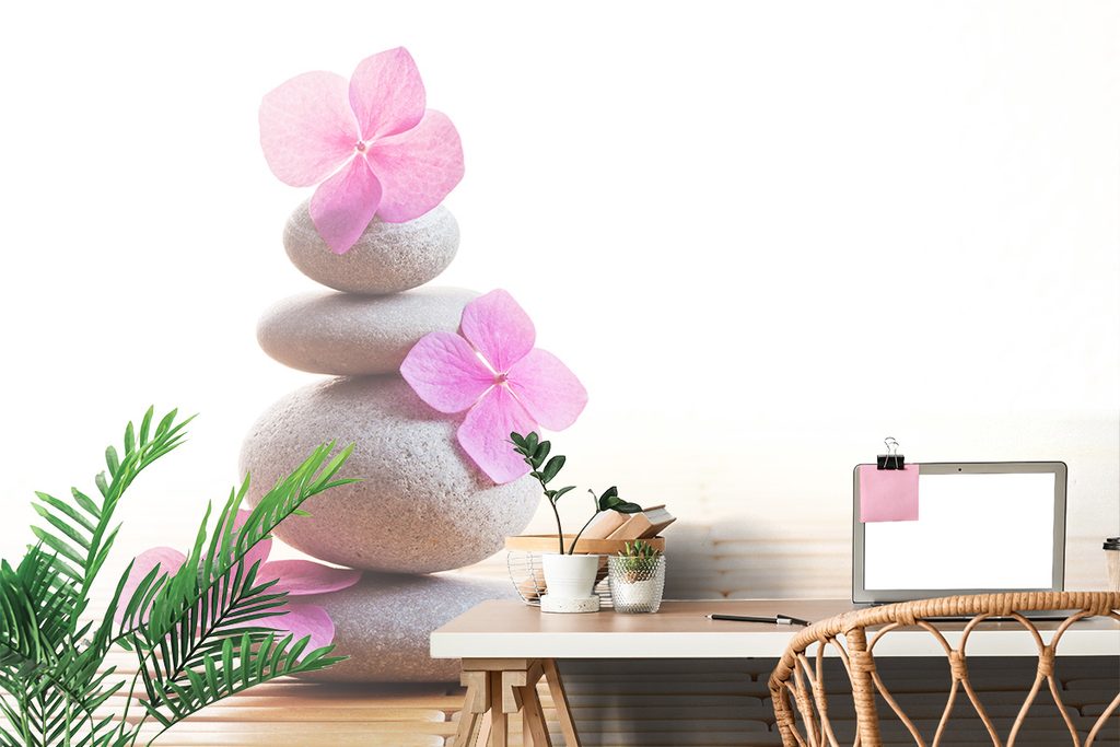 Samolepiaca fototapeta rovnováha kameňov s ružovými kvietkami