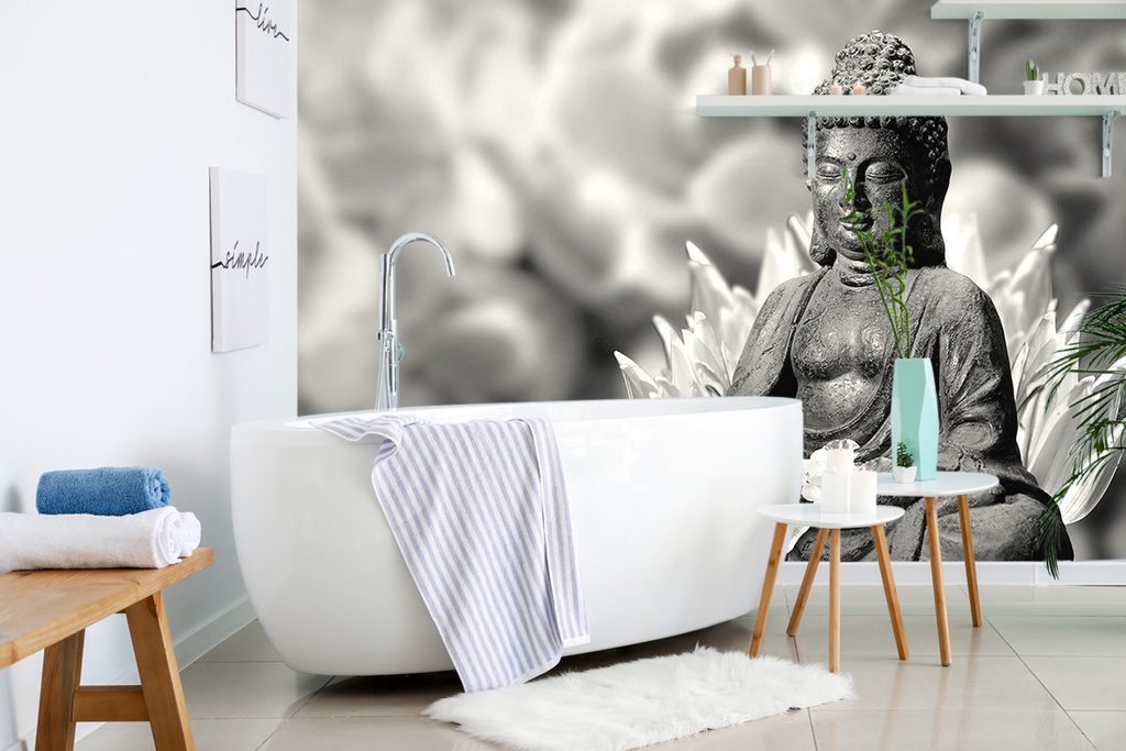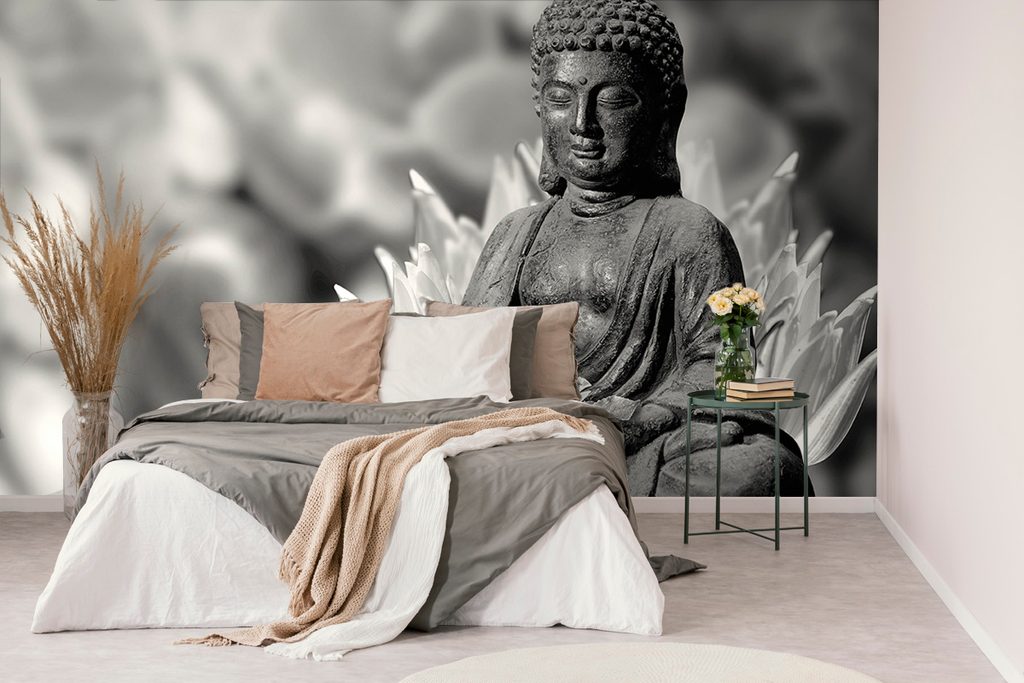 Samolepiaca fototapeta socha Budhu v čiernobielom prevedení