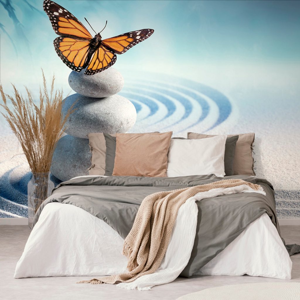 Samolepiaca fototapeta súlad motýľa s kameňmi na abstraktnom pozadí