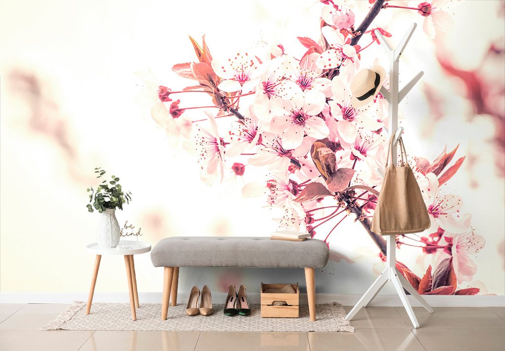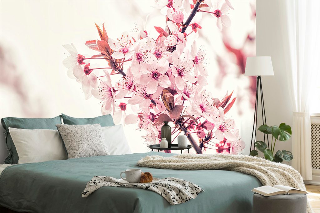 Samolepiaca fototapeta vetvička ružovkastých kvetov čerešne