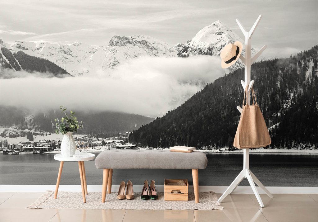 Samolepiaca fototapeta zasnežené pohorie v čiernobielom prevedení