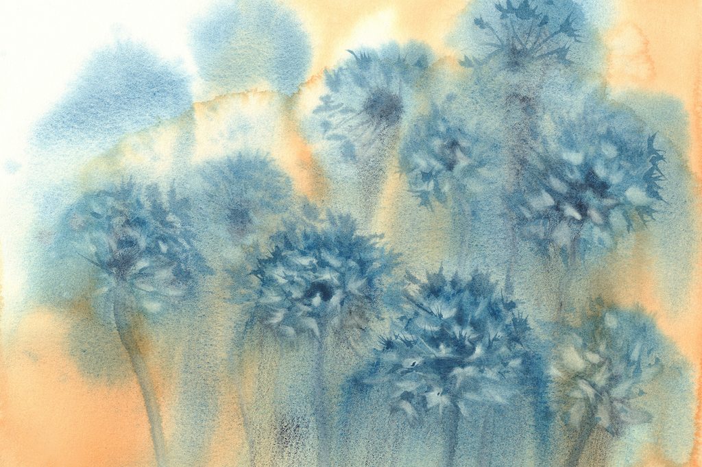 Samolepiaca tapeta akvarelová maľba púpavy v odtieňoch modrej