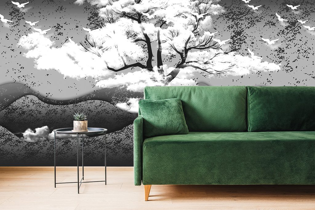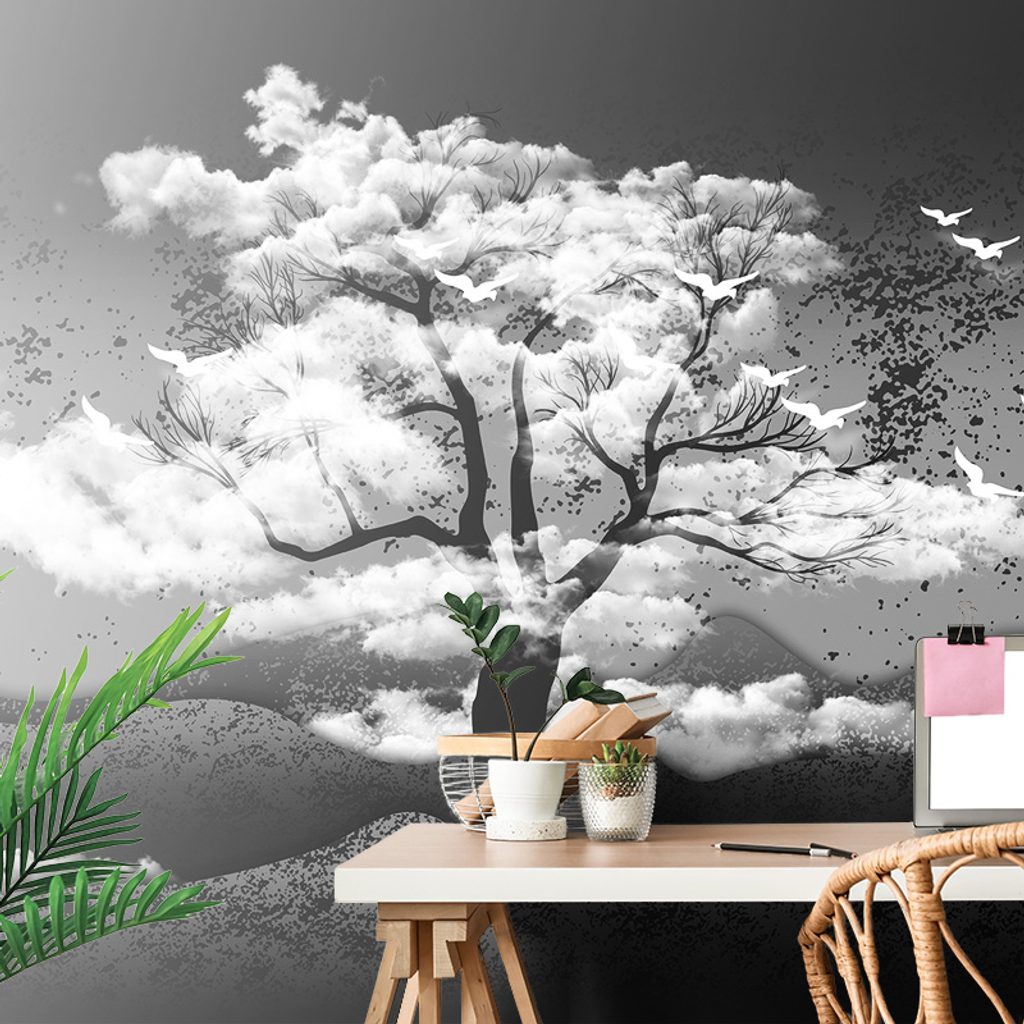 Samolepiaca tapeta čiernobiely strom v oblakoch