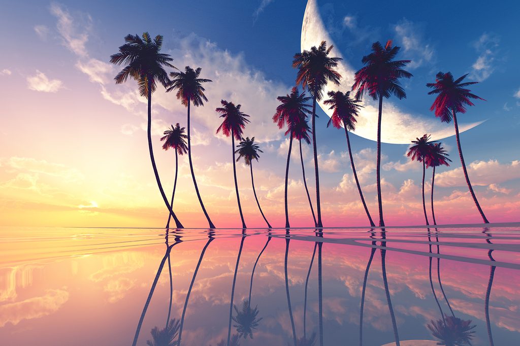 Samolepiaca tapeta exotické palmy pri zapadajúcom slnku