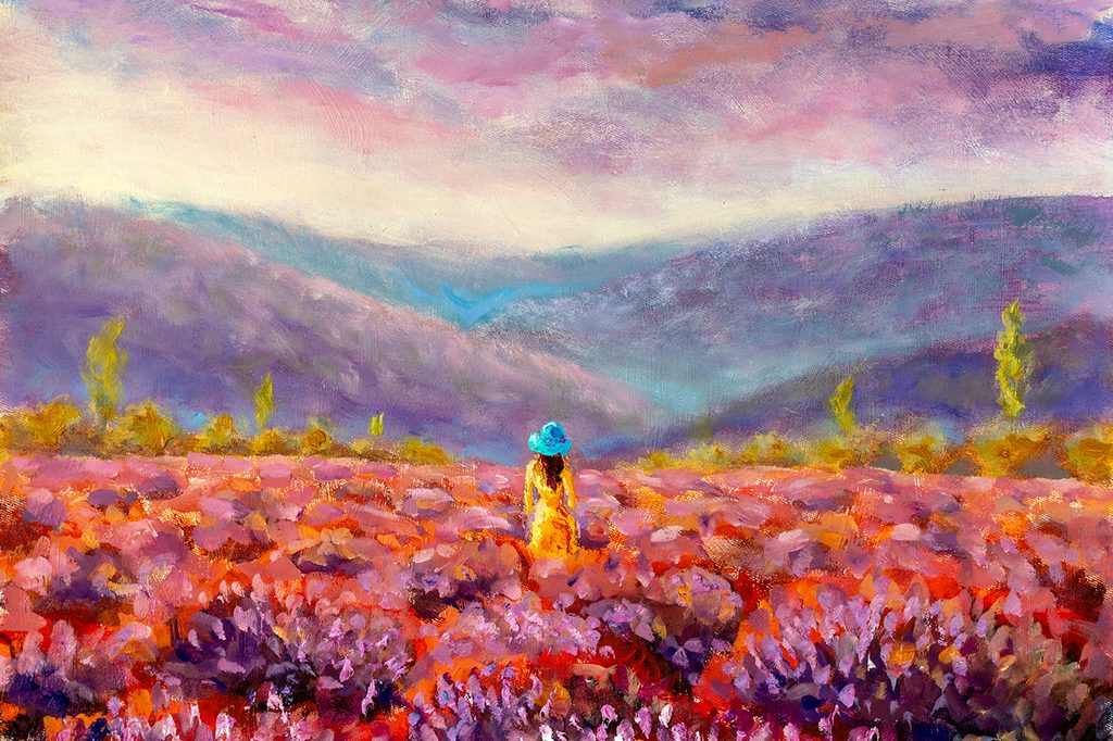 Samolepiaca tapeta maľba ženy uprostred kvetinovej lúky