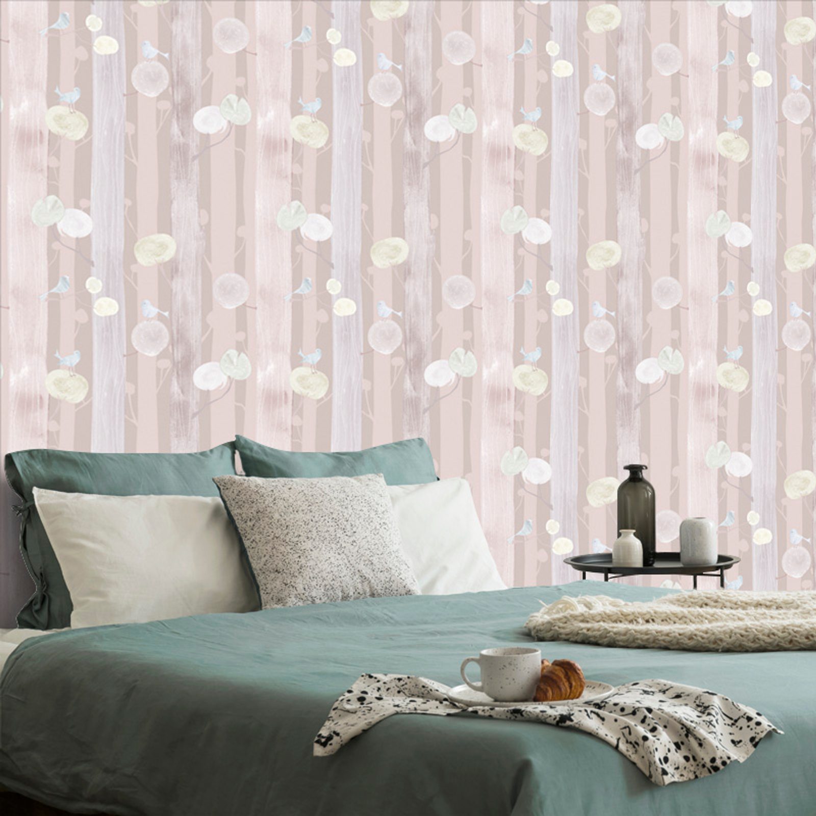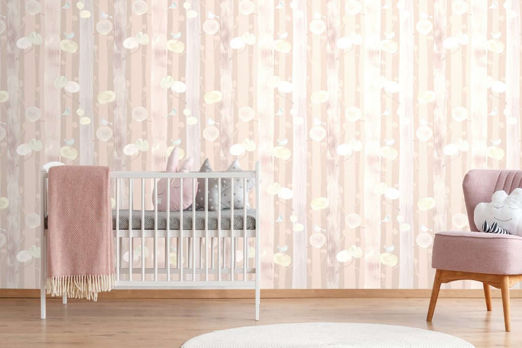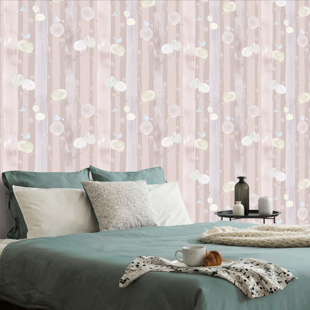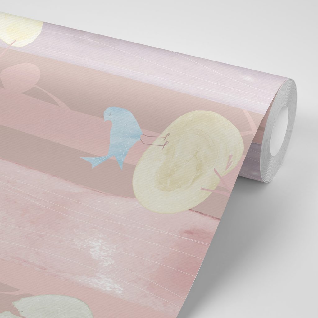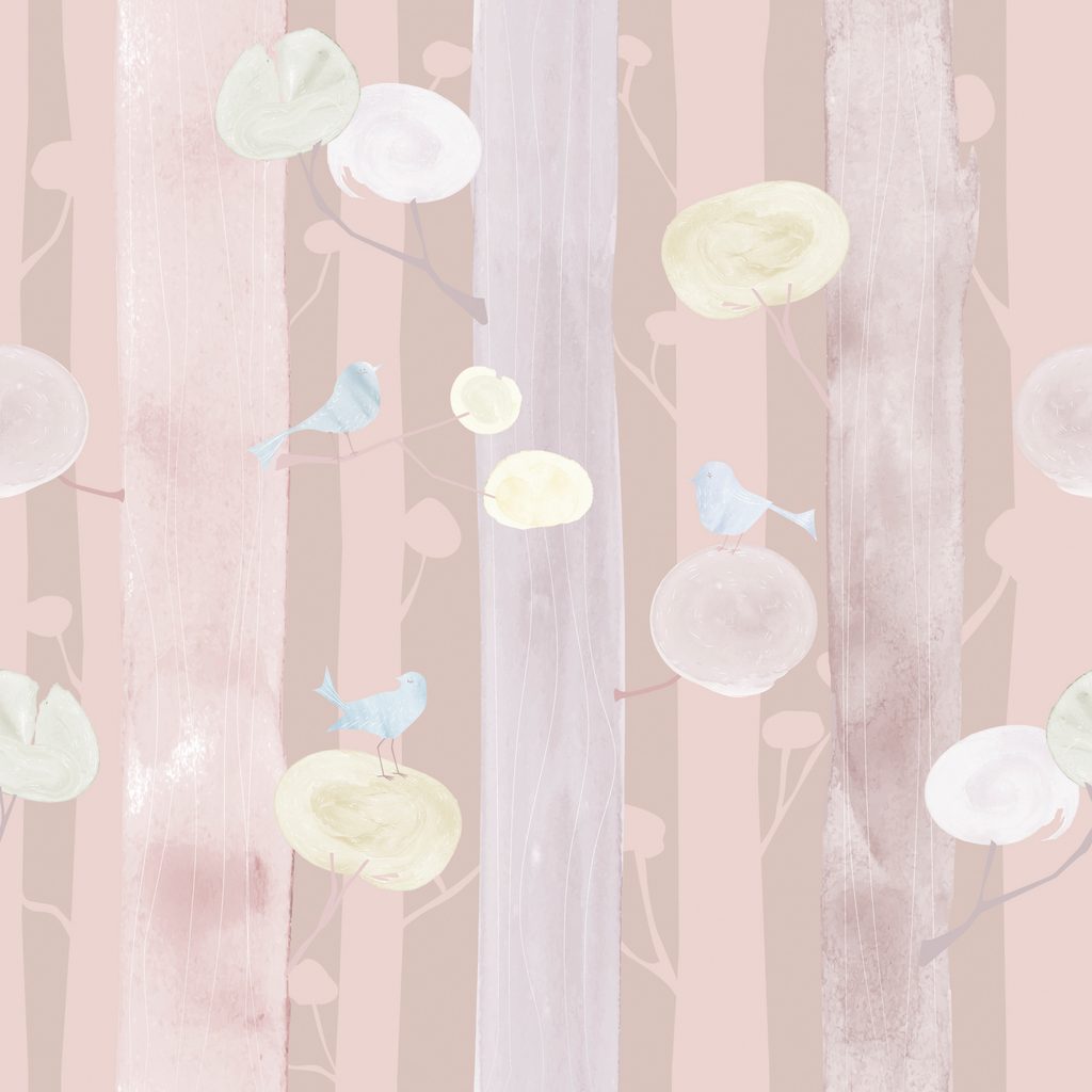 Samolepiaca tapeta vtáčiky na konároch na ružovom pozadí