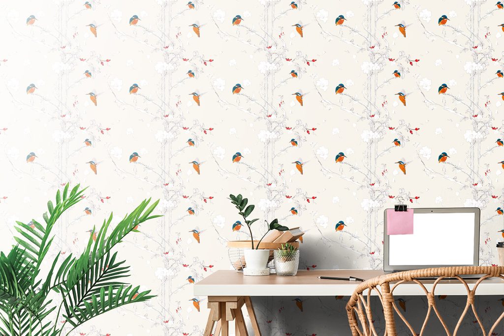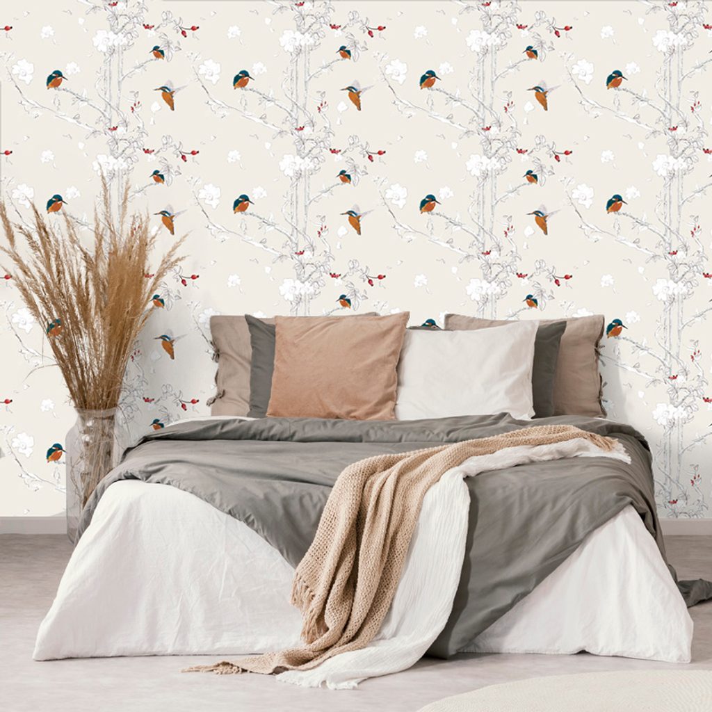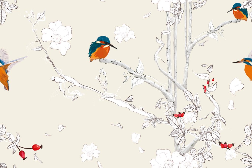 Samolepiaca tapeta vtáčiky v šípkových kríkoch na béžovom pozadí