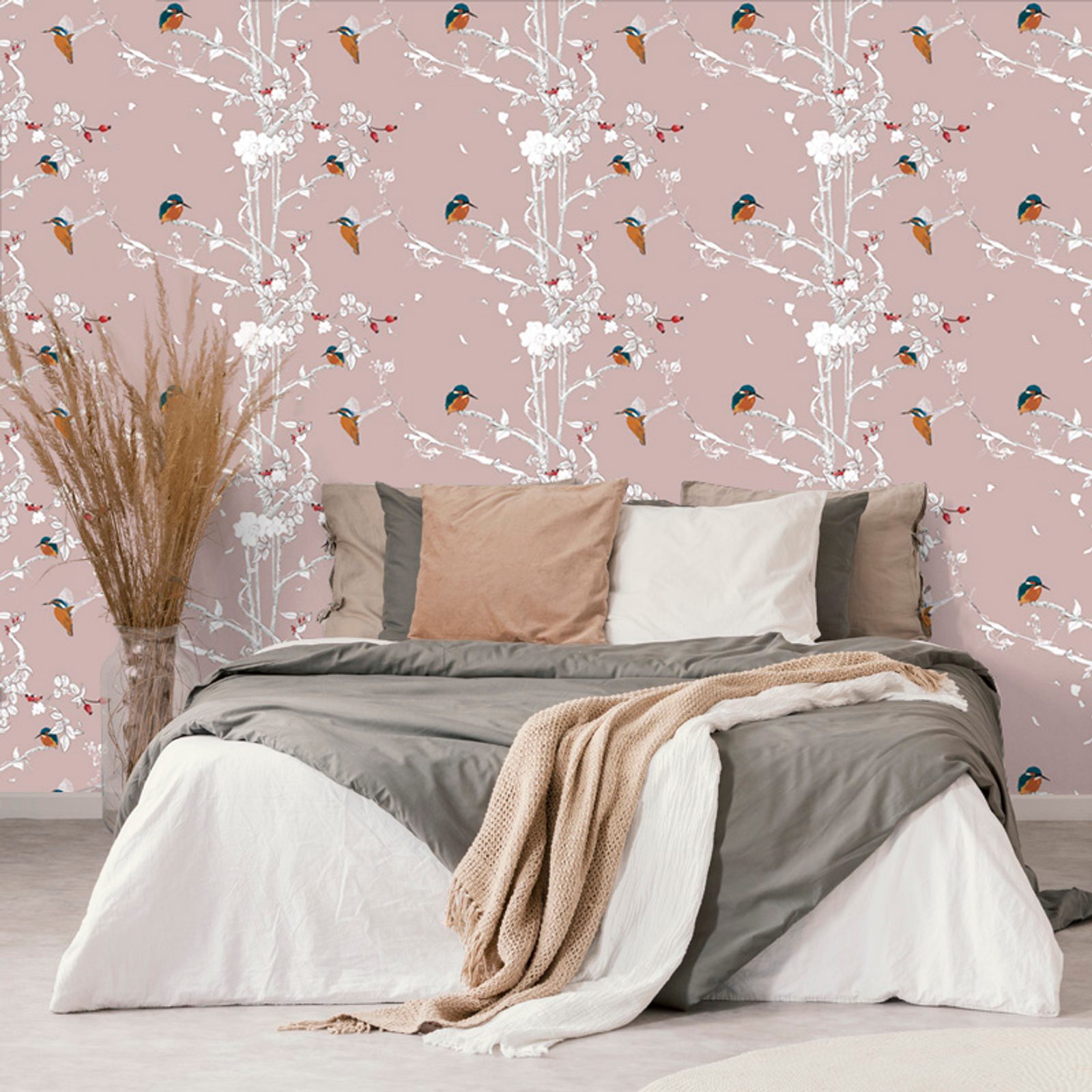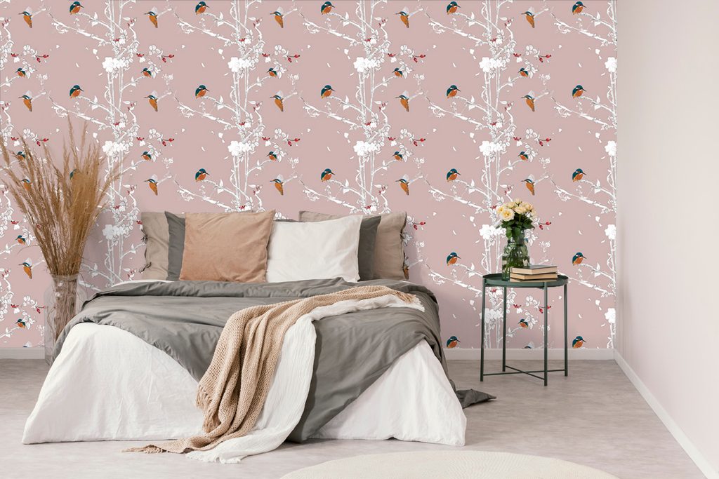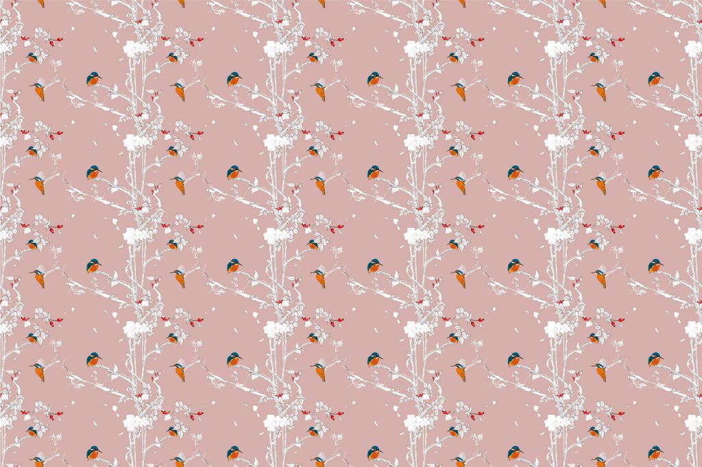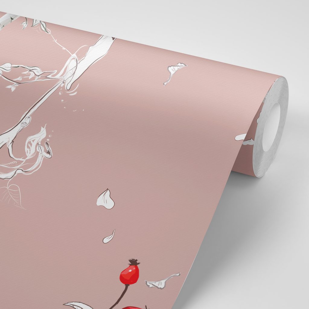 Samolepiaca tapeta vtáčiky v šípkových kríkoch na ružovom pozadí