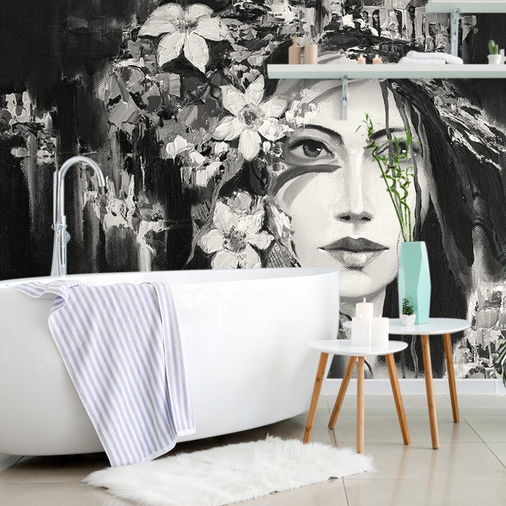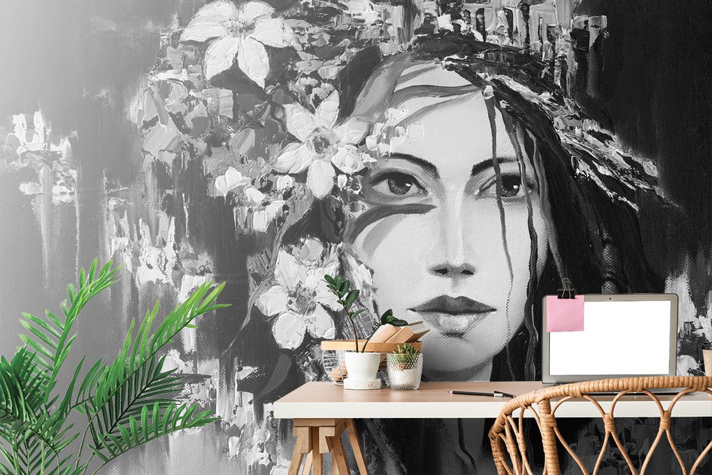 Tapeta čiernobiela maľba dievčaťa s kvetinami