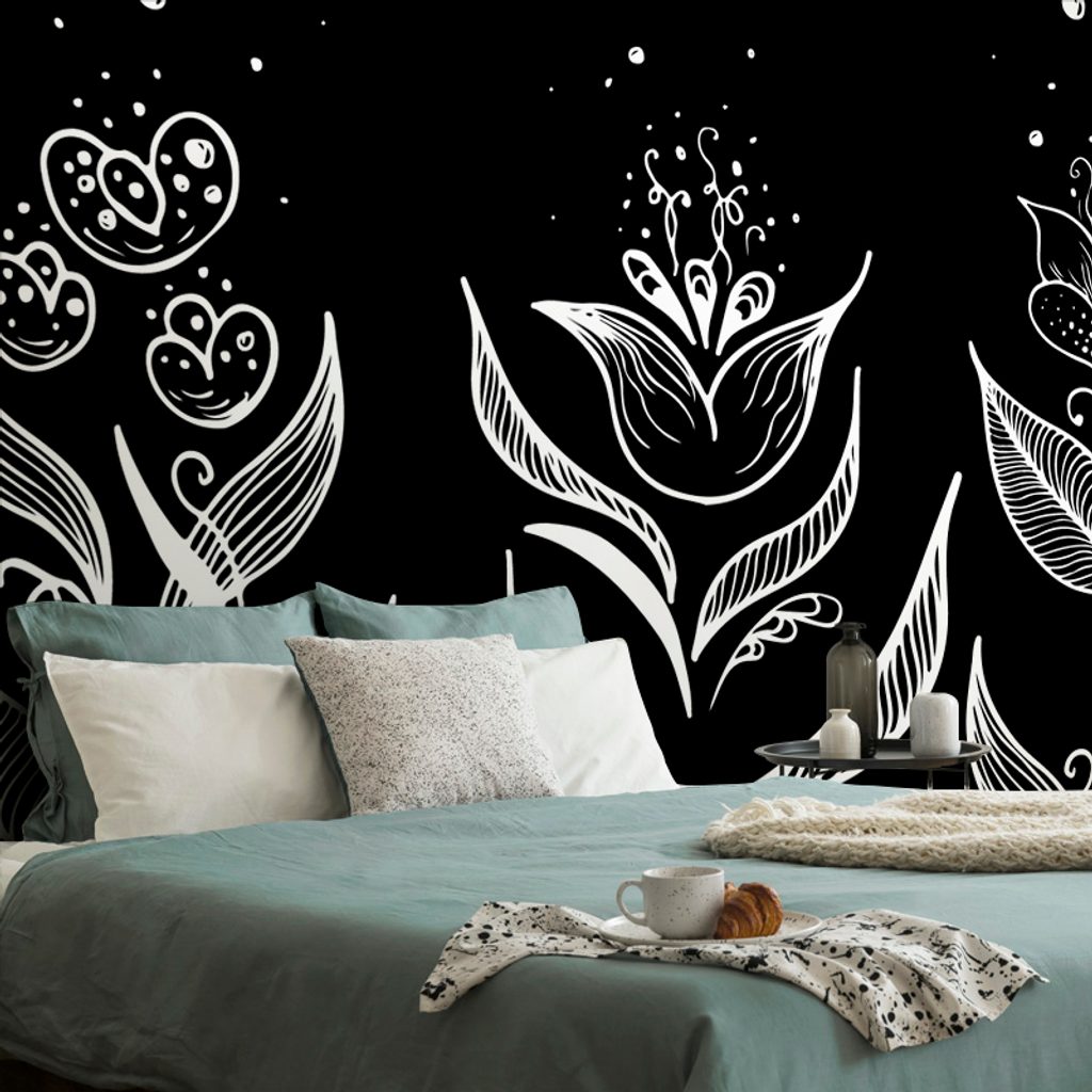 Fototapeta čiernobiela zen záhrada s kameňmi a kvetmi