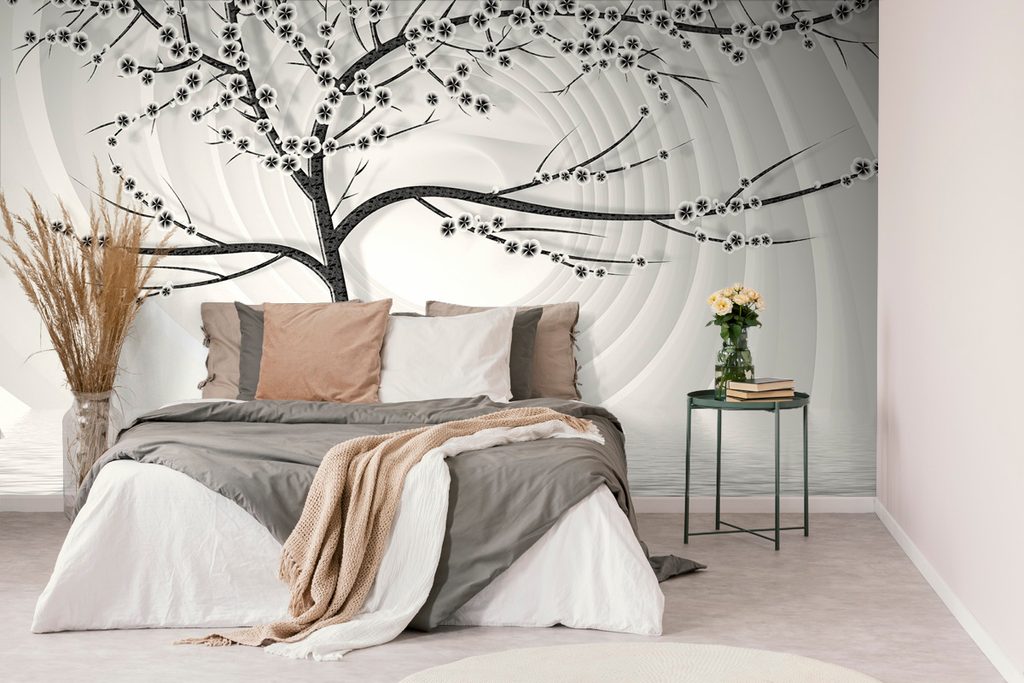 Tapeta čiernobiely strom s kvetmi na abstraktnom pozadí